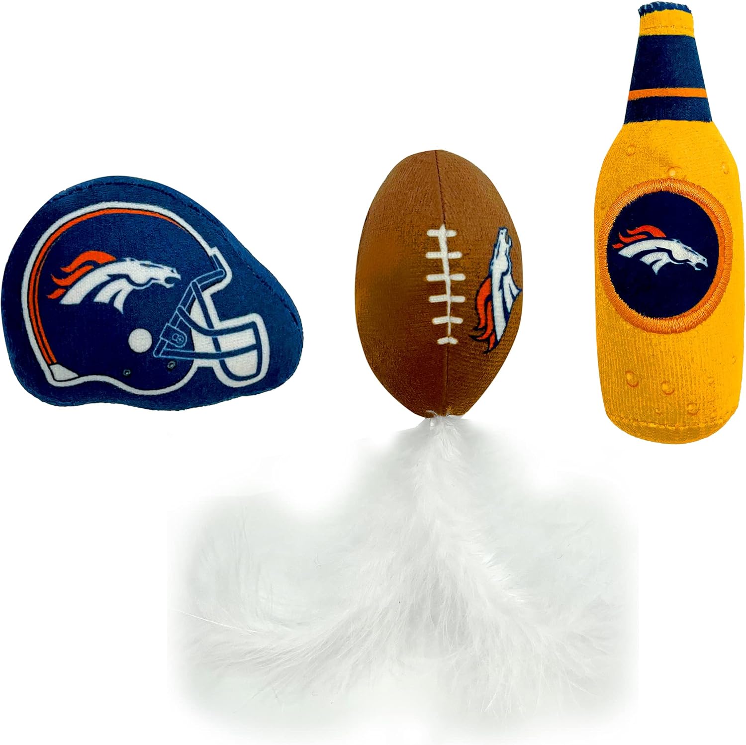 Best Plush CAT Toy - NFL Denver Broncos Complete Set of 3 Piece Cat Toys Filled with Fresh Catnip. Includes: 1 Helmet Cat Toy, 1 Football Cat Toy with Feathers & 1 Beer Bottle. Beautiful Team Logos
