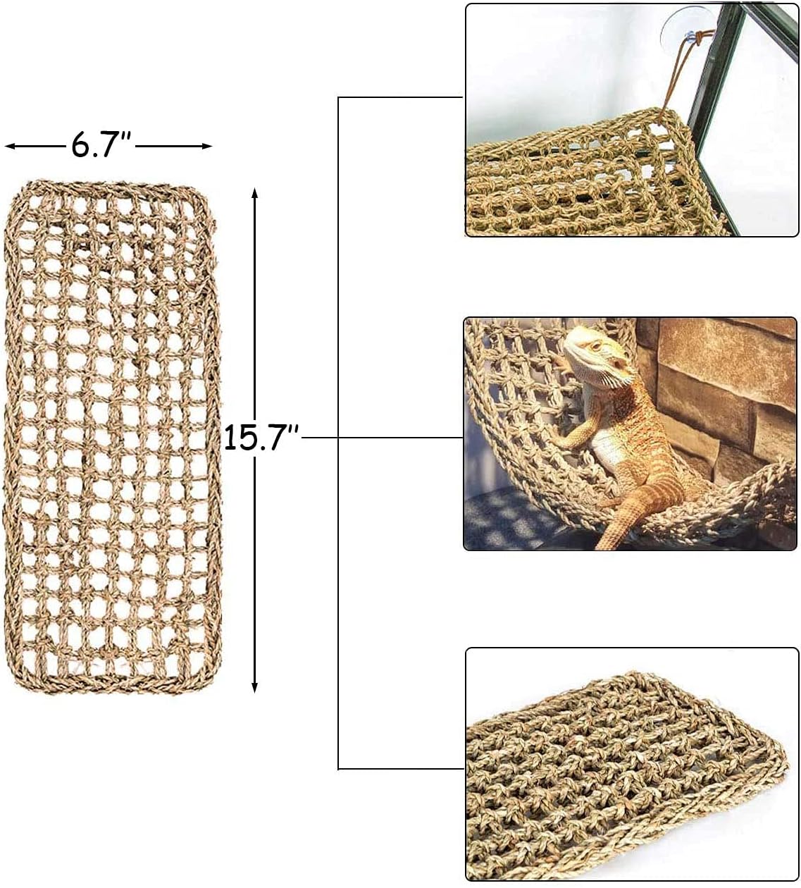 - [PACKING AND SIZE] 1 x Rectangle Seagrass Bearded Dragon Hammock(15.7 "Lx6.7" W),1 x Triangle Seagrass Hammock(16.5〞x12.6〞x12.6〞),1 x bendable vine with leaves(94.30”L),1 x Reptile plant decoration (31.1”L).In addition, we also contain suction cups and hemp rope.Suitable for bearded dragons, lizards, chameleons, tree frogs, geckos, iguana, tortoises, snakes and other reptiles