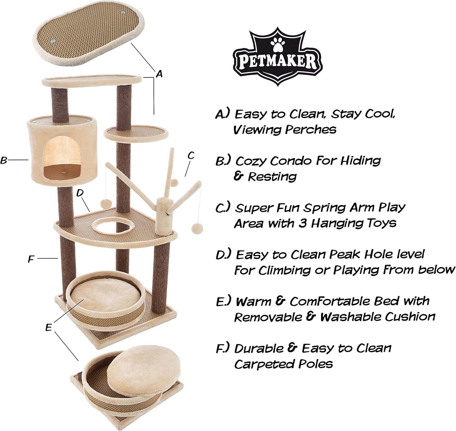 6-Tier Cat Tower- Cushioned Pet Bed, Napping Perches, Kitty Condo Hut, and Spring Arms with 3 Hanging Toys Fully Carpeted by PETMAKER (Brown/Beige)