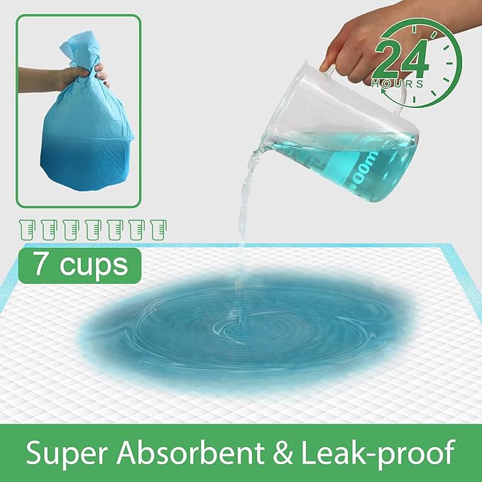 - Leak-proof Protection to Keep Your Home Clean: Each of large dog potty pads features the new upgraded plastic backing (thickened PE film) which is much more leak-proof, tear-resistant, and durable than most pet training pads in the market as the last-layer of the puppy pads. It can protect your floors, carpets, sofas, chairs, mattresses, beds, etc. from the urine damage by blocking leaks. It holds up to 7 cups of liquid.