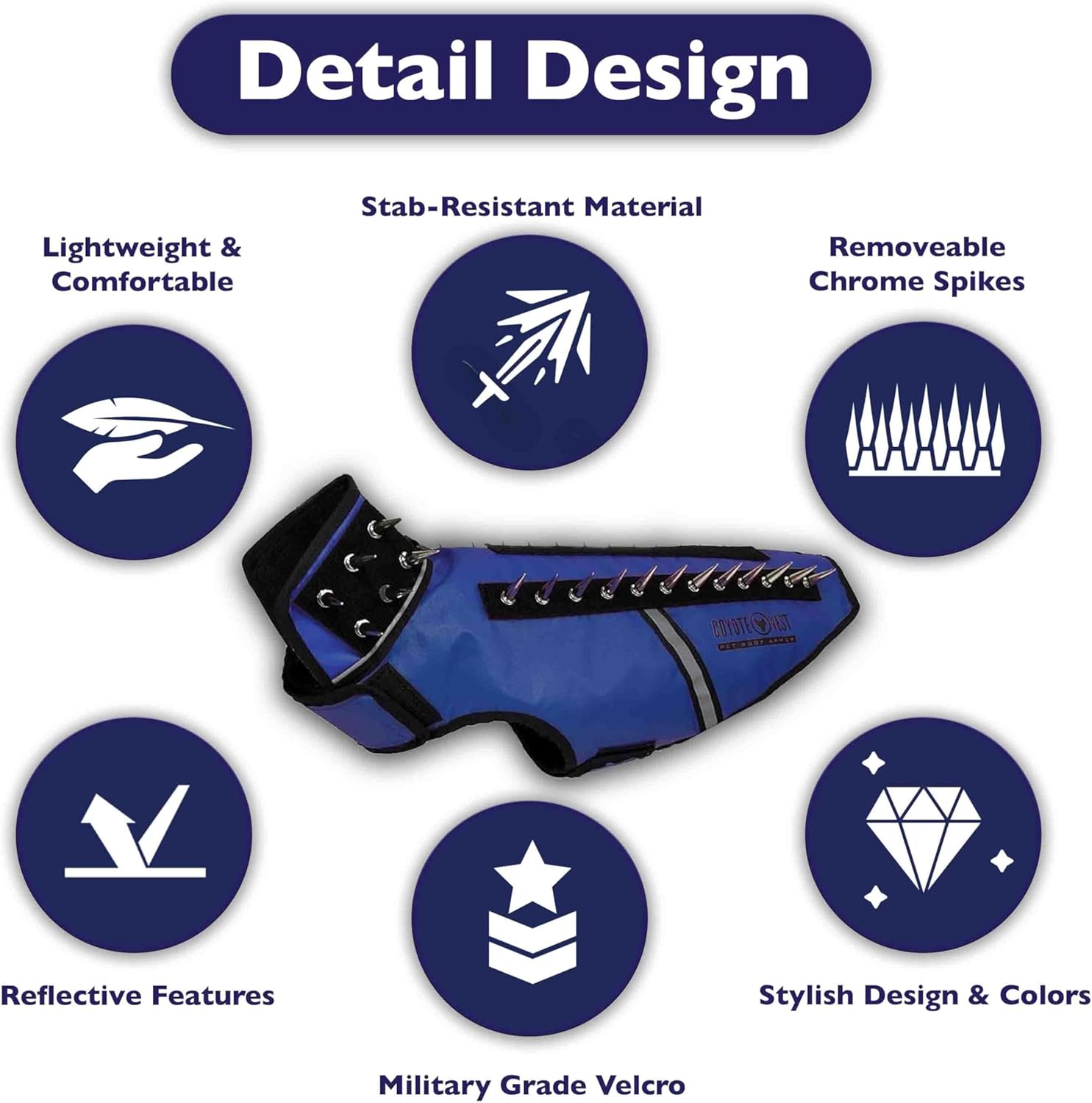 - NECK AND BODY PROTECTION: SpikeVest includes a vest with removable chrome spikes; Neck spikes and 2 strips of spikes for the back. Made with super tough puncture resistant Cordura fabric that's stab-resistant to withstand the sharp canine teeth of coyotes and aggressive dogs.