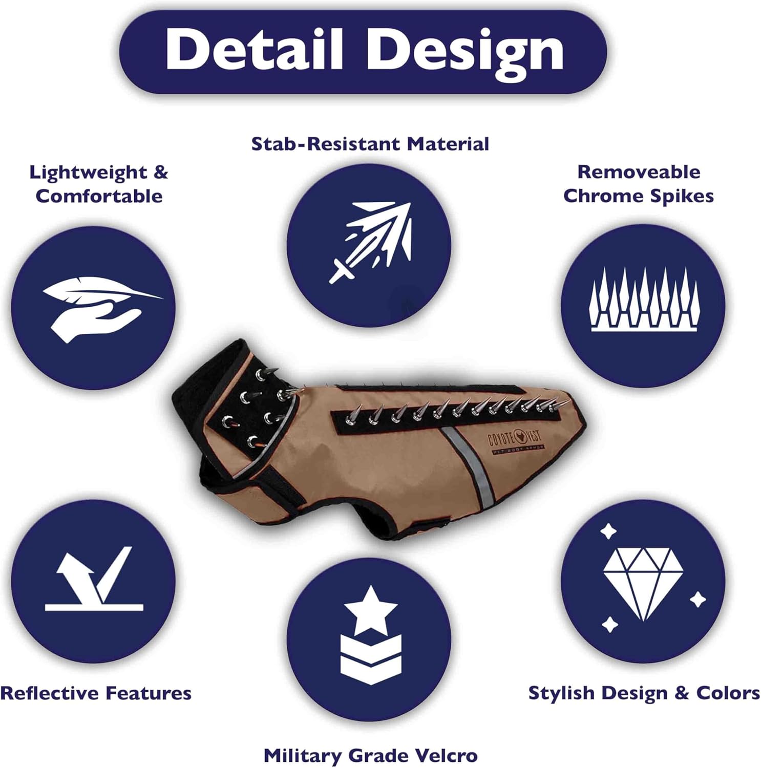 - COYOTE DOG VEST: PLEASE READ SIZING GUIDE BEFORE PURCHASING! Like a CoyoteVest, the purpose of the SpikeVest is to help slow down or prevent a surprise attack and give you enough time to react before serious injury occurs. The main difference is the SpikeVest uses two wide belts with Velcro while the CoyoteVest uses nylon straps with snap buckles.