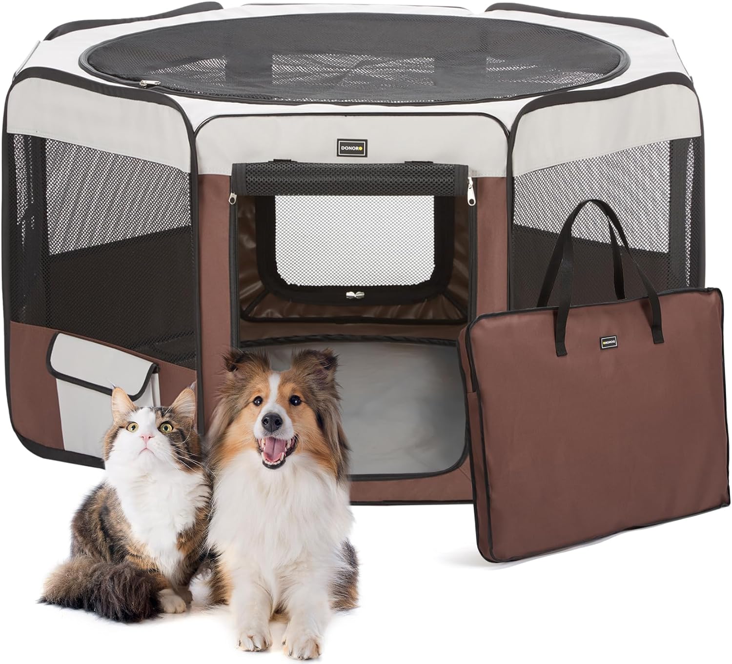 DONORO Dog Playpen 46" Portable Pet Play Pens for Small Medium Dogs, Foldable Exercise Kennel Tent Crate Indoor/Outdoor Travel Camping, Removable Top/Bottom (Brown, Large (46"x46"x23"), 8)