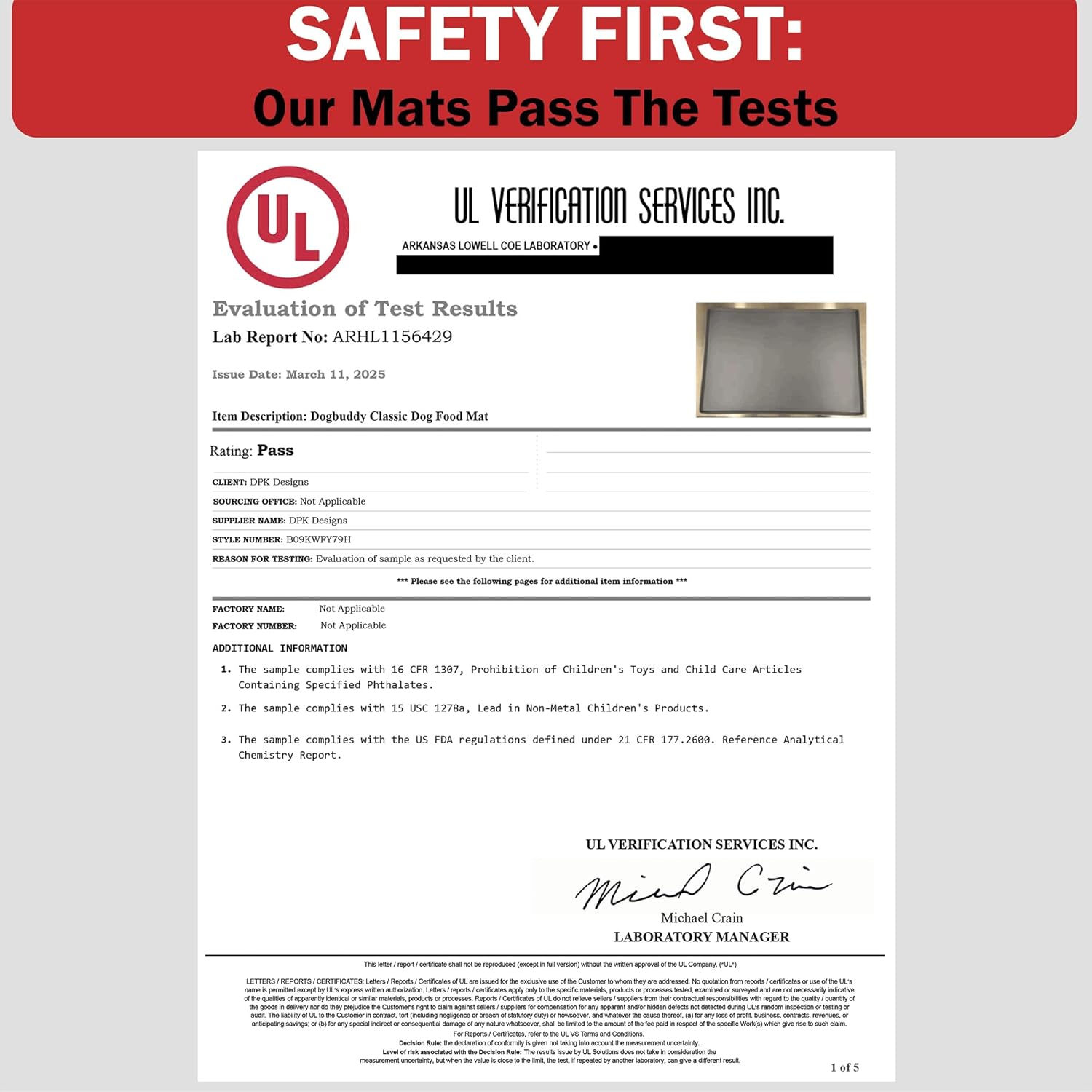 - Safe For Pets: DogBuddy Dog Food Mat is made of premium food grade silicone. It is free from nasty chemicals like BPA, PVC and Phthalate and is certified by world leading third-party laboratories (UL).