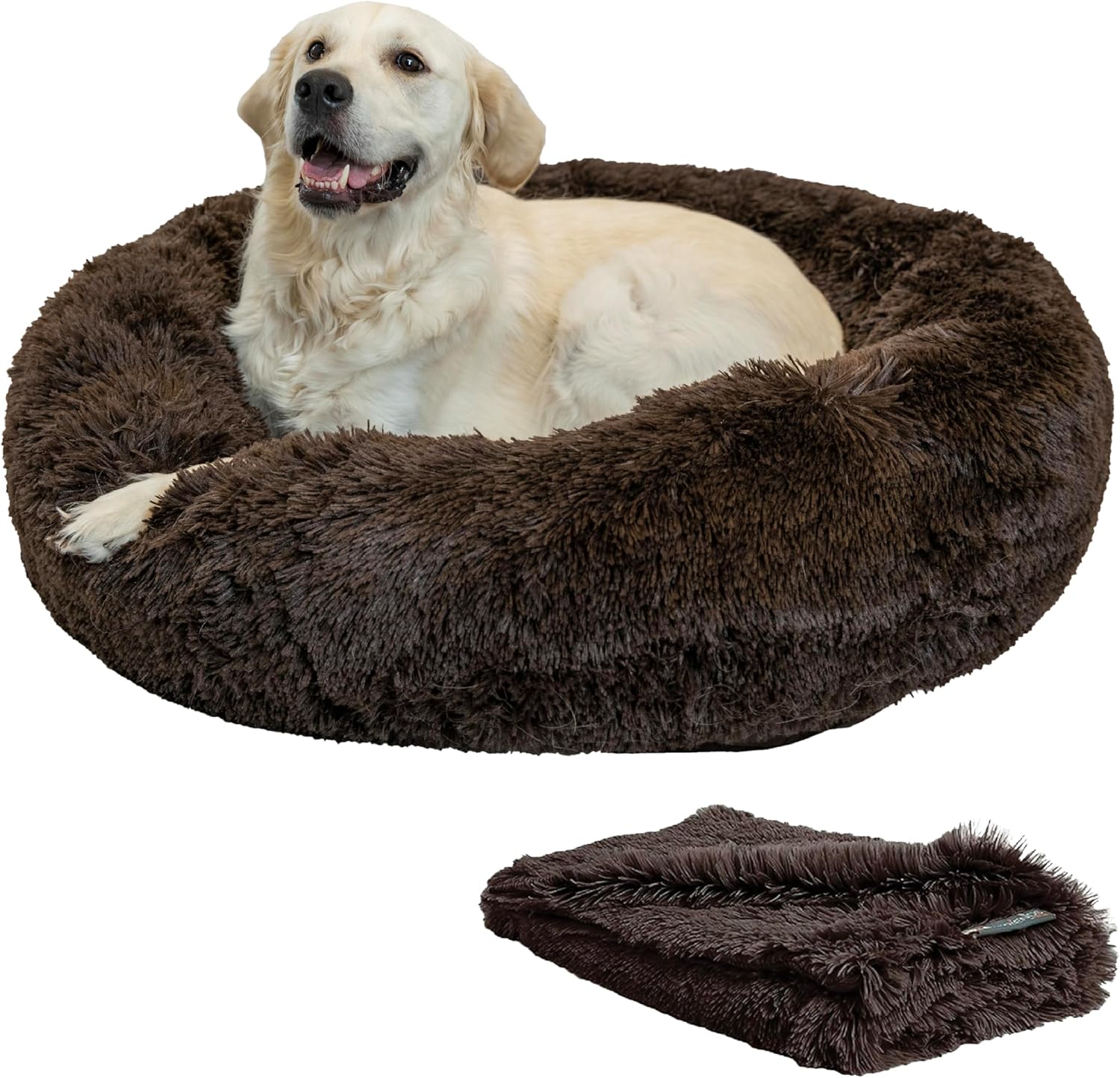Best Friends by Sheri Bundle Set The Original Calming Shag Donut Cuddler Cat and Dog Bed + Pet Throw Blanket, Dark Chocolate, Large, 36x36