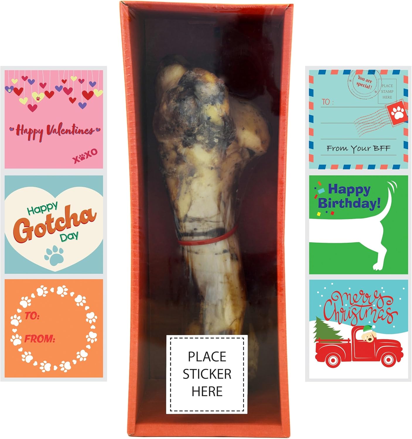 - NATURAL & NUTRITIOUS: Includes 1 Giant Beef Bone for dogs. Our natural hickory smoked 12-14" Giant Beef Bone is trimmed with meaty tidbits and best for large size dogs and aggressive chewers. These giant dog bones will give your dog ultimate enjoyment and long lasting entertainment. Christmas box included.