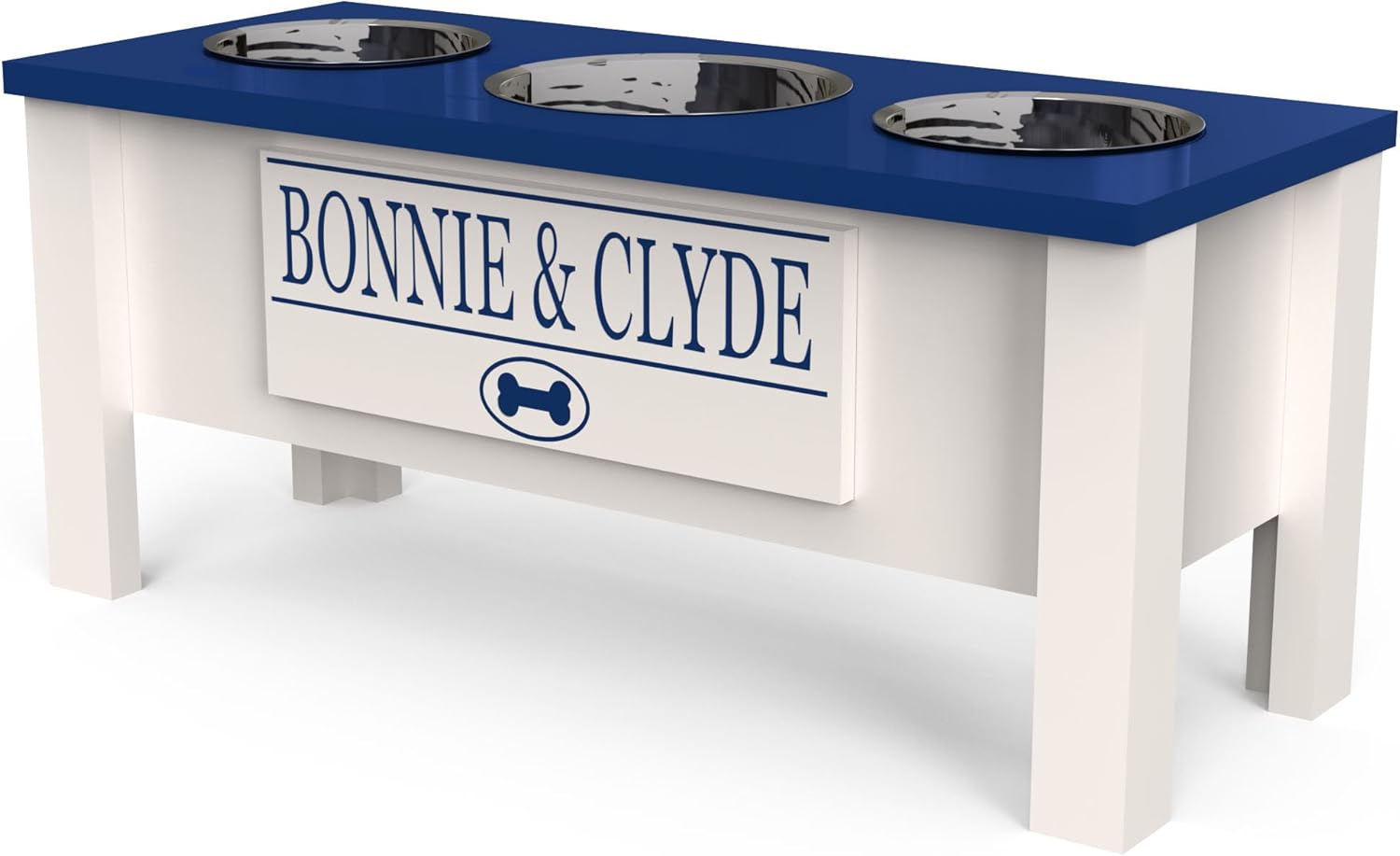 GrooveThis Woodshop - Personalized Elevated Triple Dog Bowl Stand for Large, Medium, Small, X-Small Dogs - 3 Stainless Steel Food and Water Bowls - Raised Dog Dish with Internal Storage (Large, Blue)