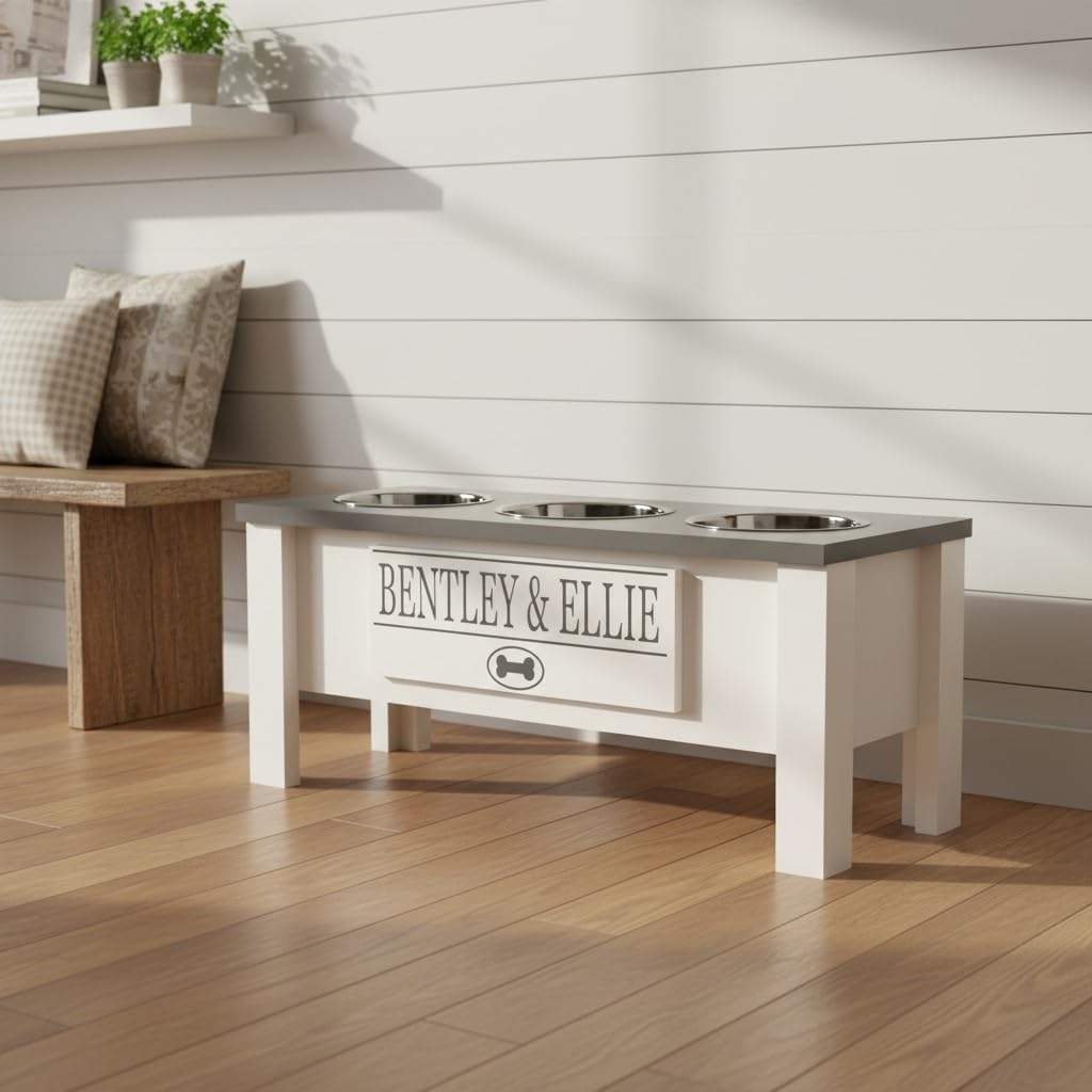 - đź’¦ Pet-Safe, Water Resistant Design đź’¦ The top surface and internal storage space of this custom dog bowl stand are treated with pet-safe, water-resistant polyurethane.
