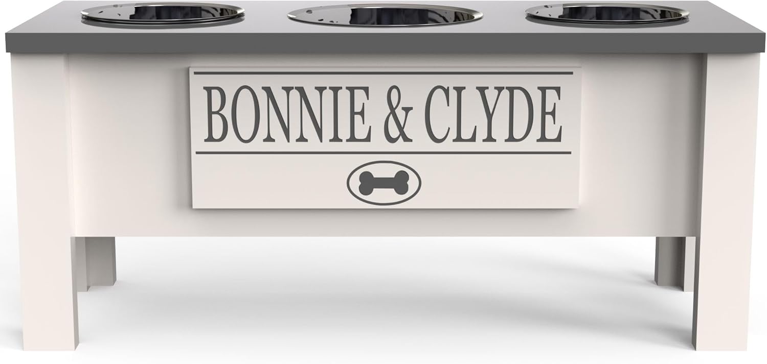 GrooveThis Woodshop - Personalized Elevated Triple Dog Bowl Stand for Large, Medium, Small, X-Small Dogs - 3 Stainless Steel Food and Water Bowls - Raised Dog Dish with Internal Storage (Large, Grey)