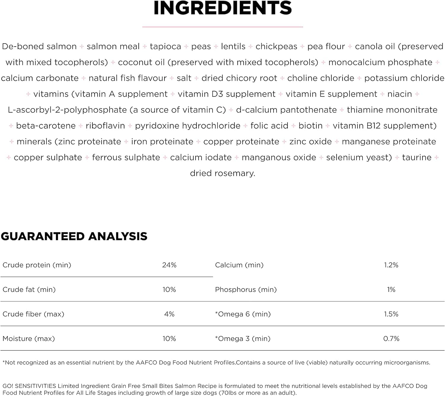 Go! Solutions Sensitivities Limited Ingredients, Grain-Free Dry Dog Food, Small Bites Salmon Recipe for Sensitive Stomach, 3.5 lb Bag
