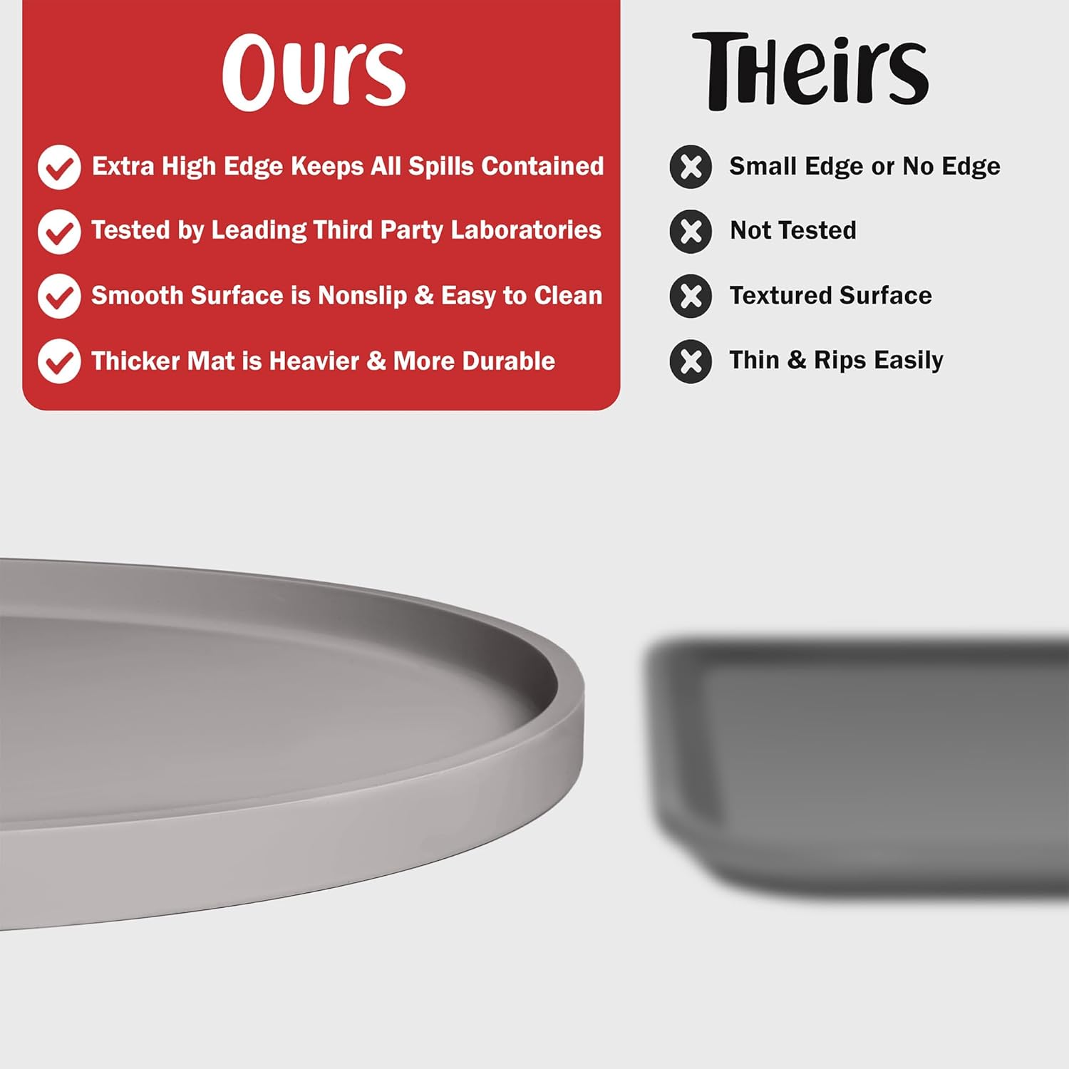 - EFFECTIVE: Super high and thick outer lip (edge) keeps all spilled food and water splashes contained on the pet food mat and away from your floor. Silicone is naturally 100% waterproof. Clean lines and multiple color options allows it to blend seamlessly with any décor.