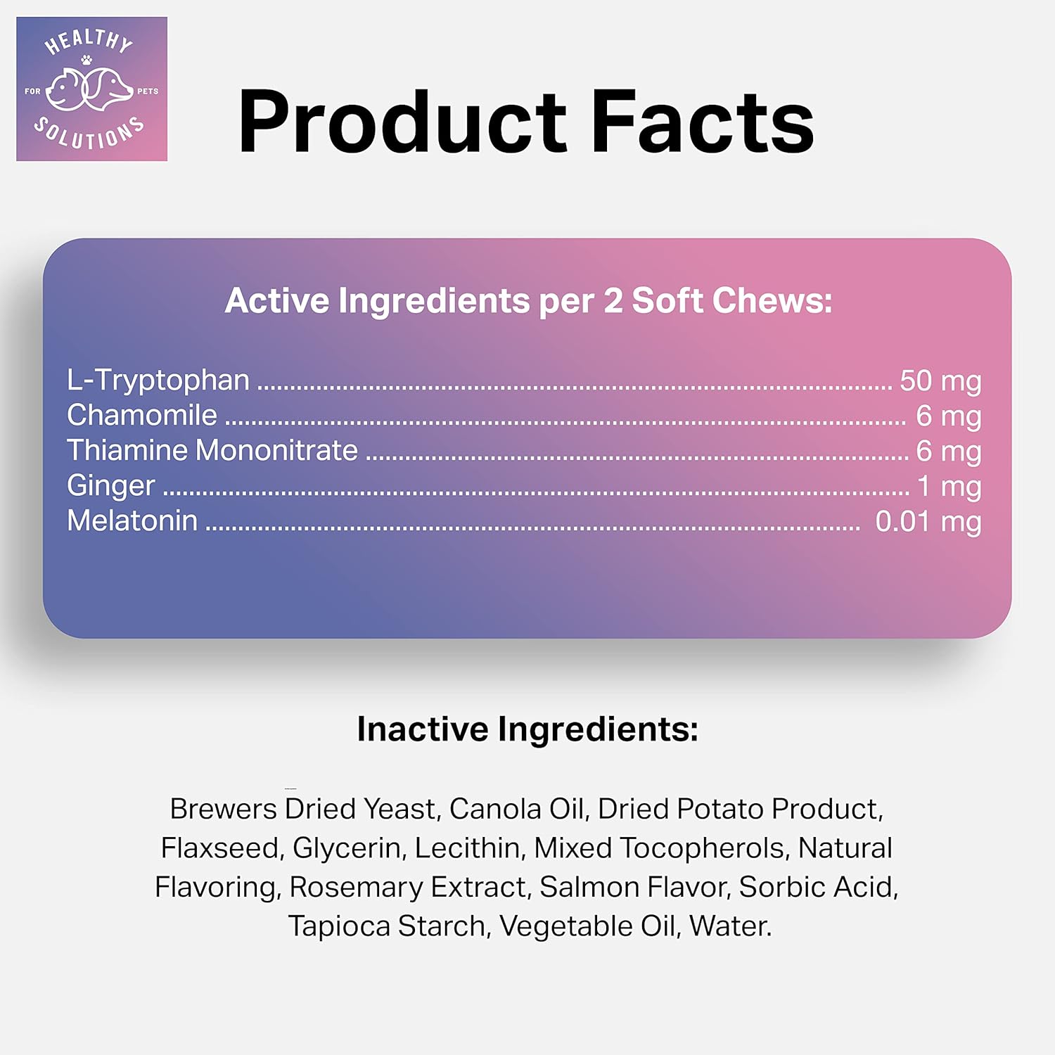 - 🗸 VETERINARIAN FORMULATED -- with Melatonin, Chamomile, Passion Flower, Thiamine, L-Tryptophan, and Ginger to help soothe sensitive stomaches.