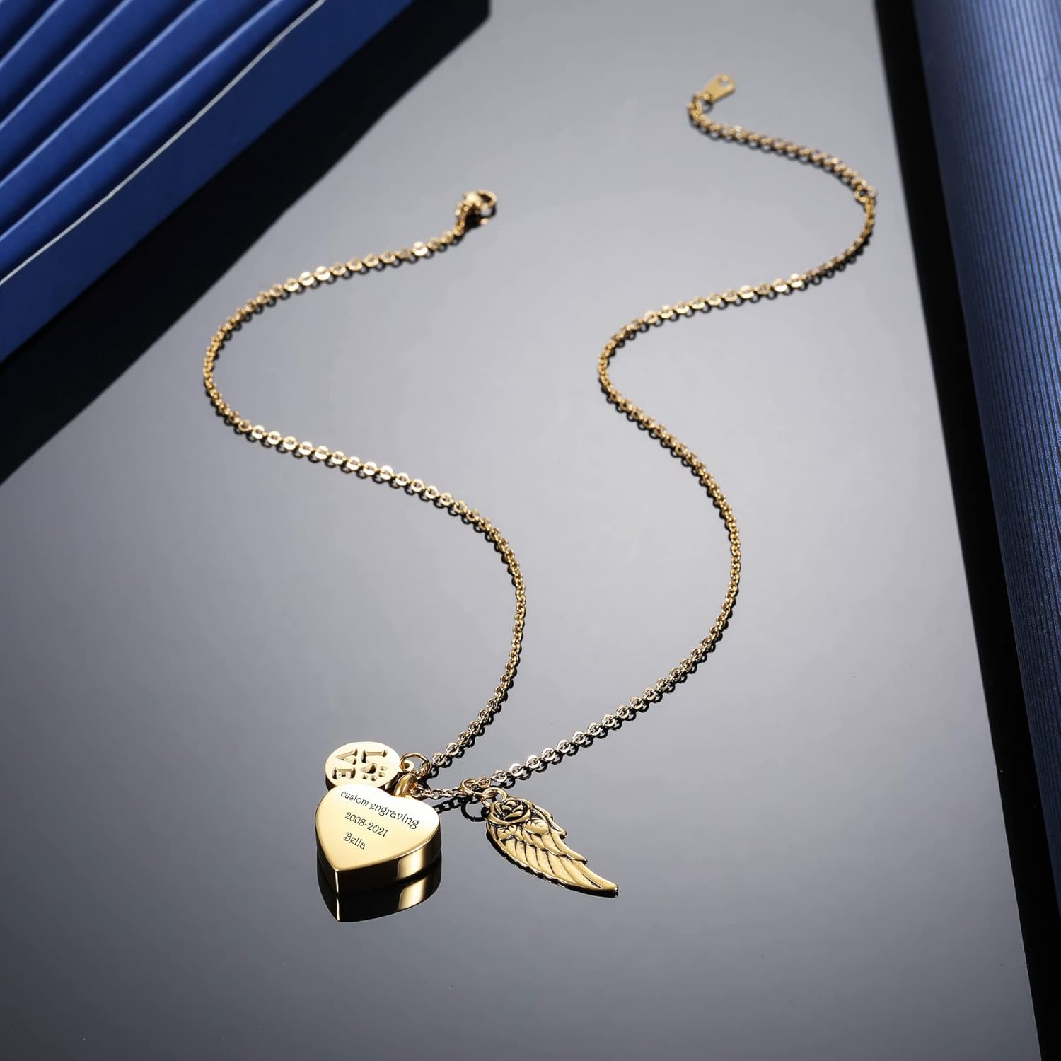 - 🐾 【PACKAGE】- ① Gold Color Heart-Shaped Urn Pendant ② One Angel Wing Pendant. ③ One "With Love" Round Pendant. ④ One Keyring, you have the option of replacing the chain with a keychain. ⑤ One Set Of Funnel Kit, it helps you fill the ashes in cremation urn. ⑥ One 2-Inches Extension Chain, It helps you adjust the length of your necklace between 18 and 20 inches.