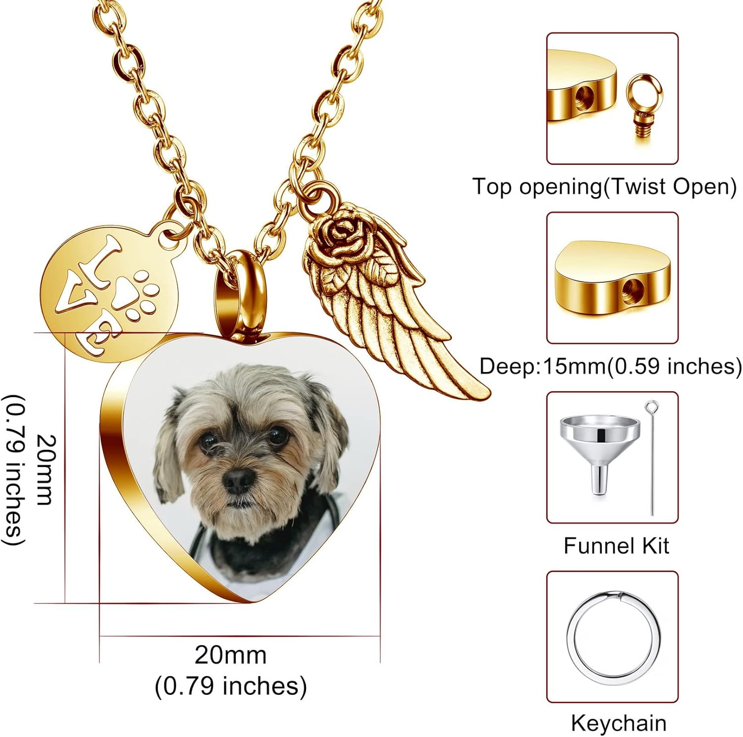 - 🐾 【PACKAGE】- ① Gold Color Heart-Shaped Urn Pendant ② One Angel Wing Pendant. ③ One "With Love" Round Pendant. ④ One Keyring, you have the option of replacing the chain with a keychain. ⑤ One Set Of Funnel Kit, it helps you fill the ashes in cremation urn. ⑥ One 2-Inches Extension Chain, It helps you adjust the length of your necklace between 18 and 20 inches.