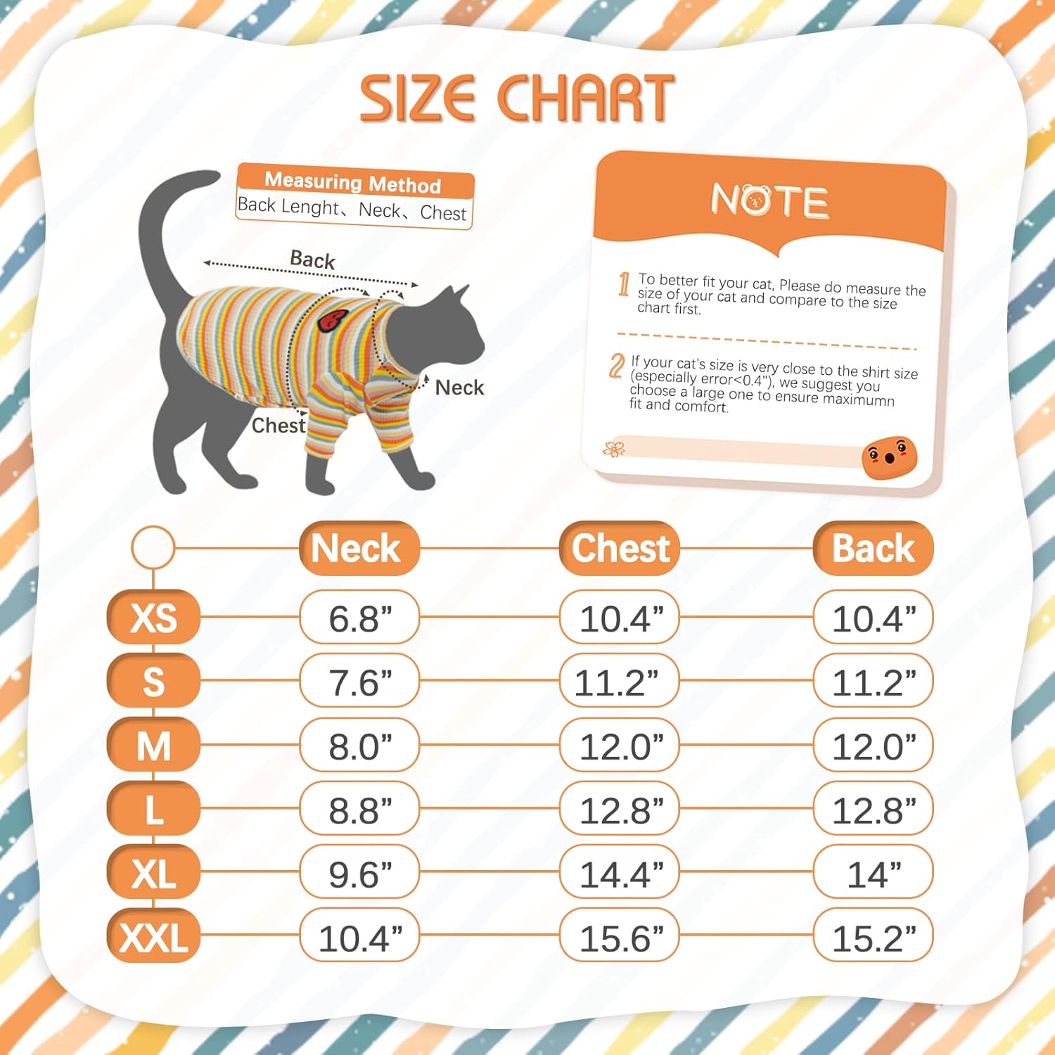 - Hairless cat clothing sizes: XS-XXL fit guide. Precise measurement chart for Sphynx cats (8-12 lbs) to large breeds (18-22 lbs). Expandable neckline with elastic armholes accommodates unique hairless cat body shapes. Two-legged design makes the shirt easy to put on and take off. Loose waist allows for comfortable running and jumping.