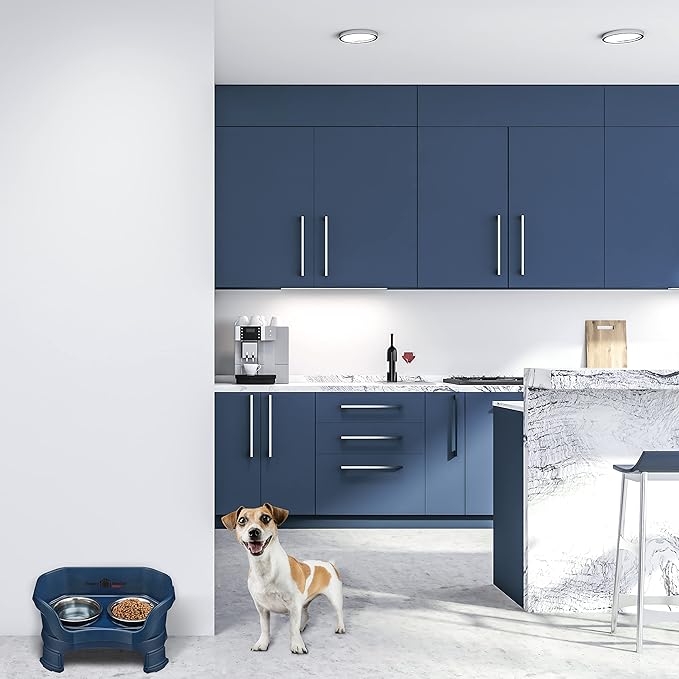 Neater Feeder Deluxe Mess Proof Dog Bowls Elevated for Small Breeds – Made in USA – No Spill Raised Dog Food Bowl Stand w/Leg Extensions – Stainless Steel Food and Water Bowl Set – Dark Blue