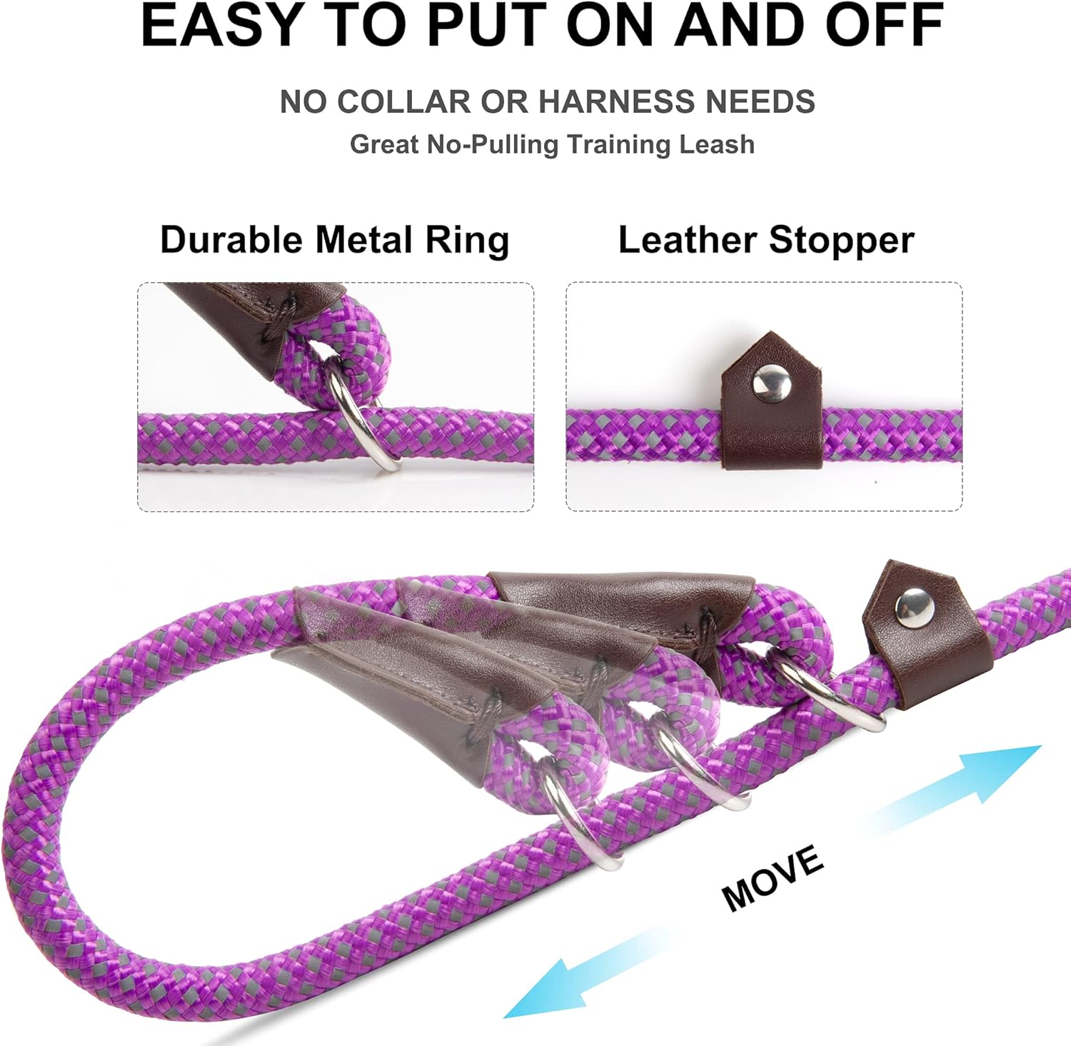 - 【STRONG & LIGHTWEIGHT】- These Premium Slip Leads for dogs are made of high strength nylon rope, super durable metal ring, and the knots bound with leather cover. 3/8” thick rope provide maximum durability and comfortable grip
