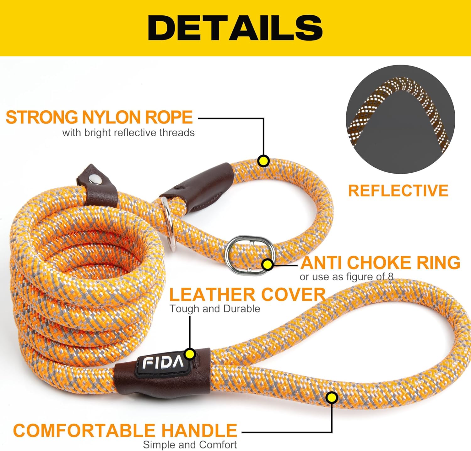 Fida Durable Slip Lead Dog Leash, 6 FT x 3/8" Heavy Duty Dog Loop Leash, Comfortable Strong Rope Slip Leash for Small Dogs and Puppies, No Pull Pet Training Leash with Highly Reflective (3/8", Orange)