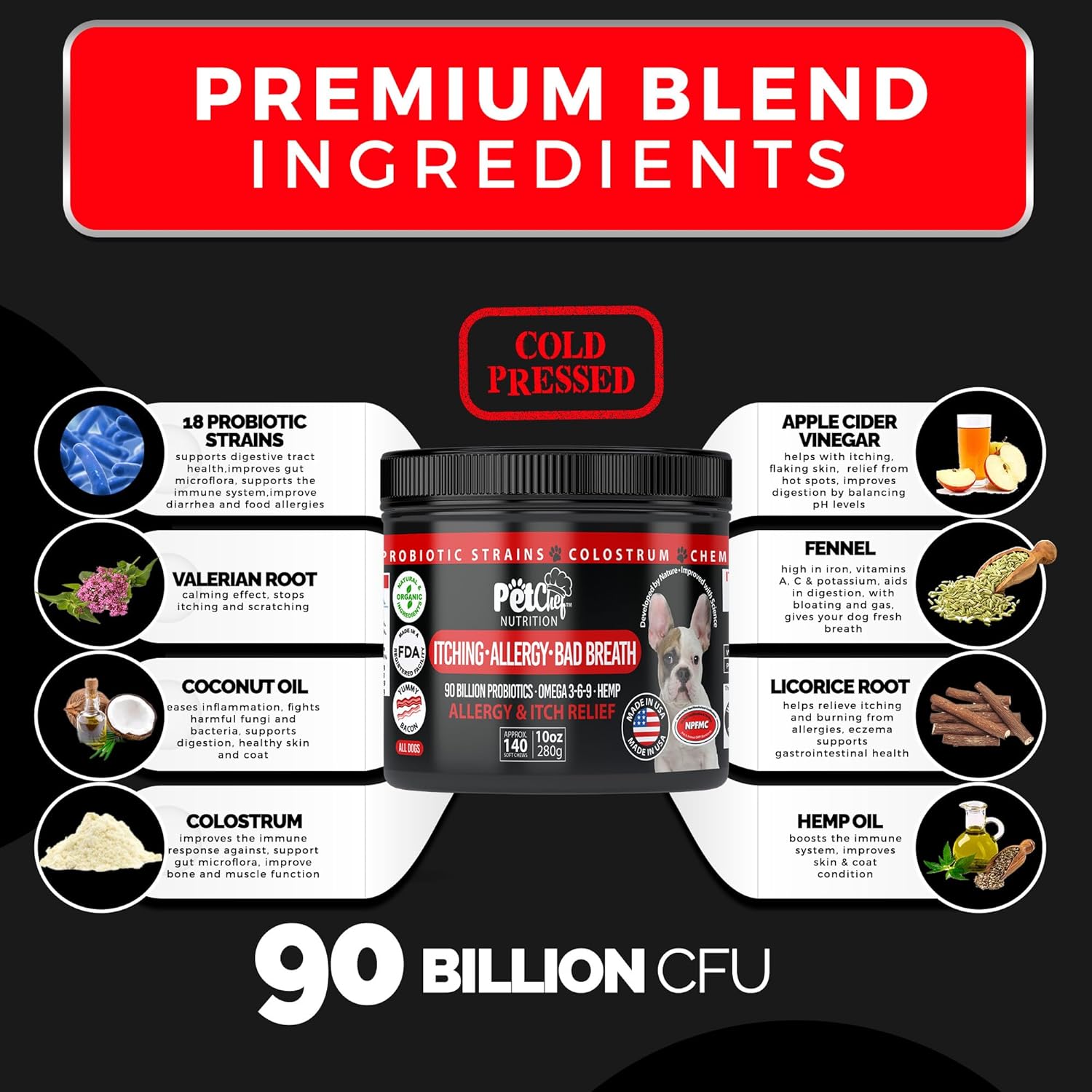 - Keep your pup happy and itch-free with Pet Chef Allergy Defender: Tame relentless itching and soothe irritated skin with this natural solution, specially crafted as a dog allergy relief chew. Infused with Omega 3 and Salmon Oil, it effectively moisturizes and nourishes your dog's coat, providing immediate allergy and itch relief for dogs. Witness a joyful transformation in your pet's demeanor as these allergen-free chews enhance their wellbeing and comfort.