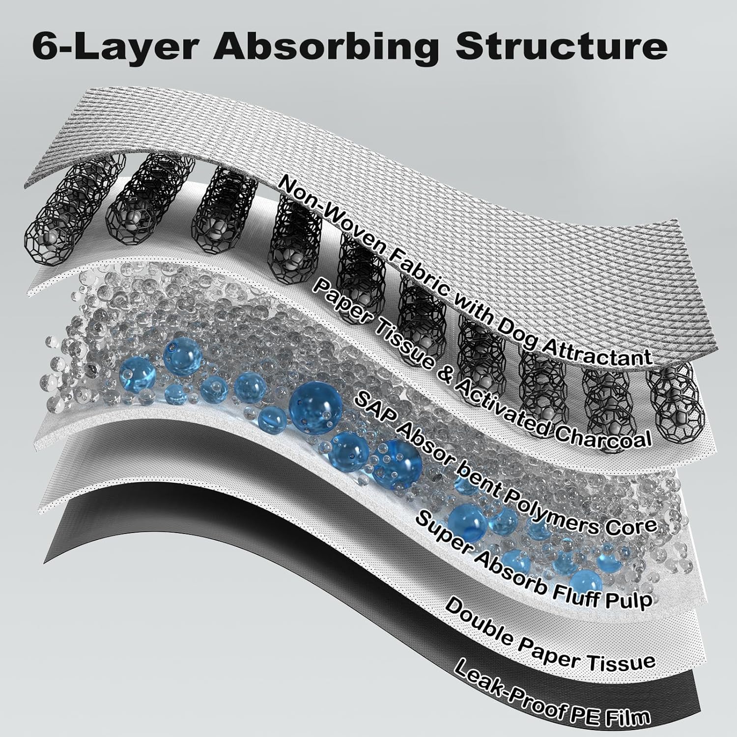 - Innovative 6-Layer Design: The paper part of this product comes from FSC-certified paper; Top non-woven fabric layer for quick absorption and fast drying; second paper tissue layer to absorb liquid; third layer of super absorbent polymer to turn liquid into gel; fourth layer of fluff pulp for extra moisture control; fifth layer of paper tissue for added protection; sixth layer of PE film to prevent leaks and protect floors