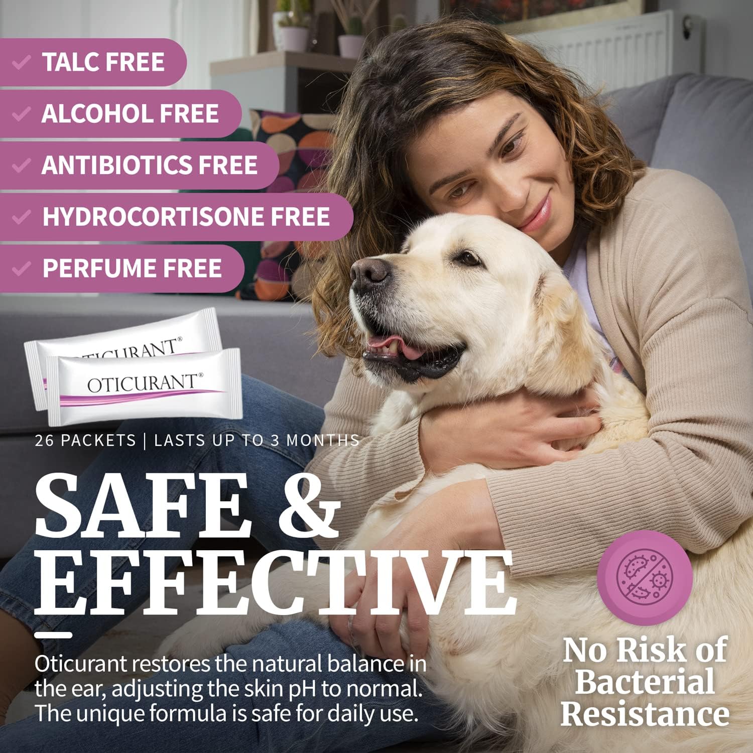 - LASTS UP TO 3 MONTHS When you use Oticurant dog ear powder for the first time, give your dog one dose per ear and day for five consecutive days. After five days, give your dog a maintenance dose in each ear once a week. Your dog will get cleaner ears within 3 weeks. The 26 packets included lasts up to three months for a midsize dog.