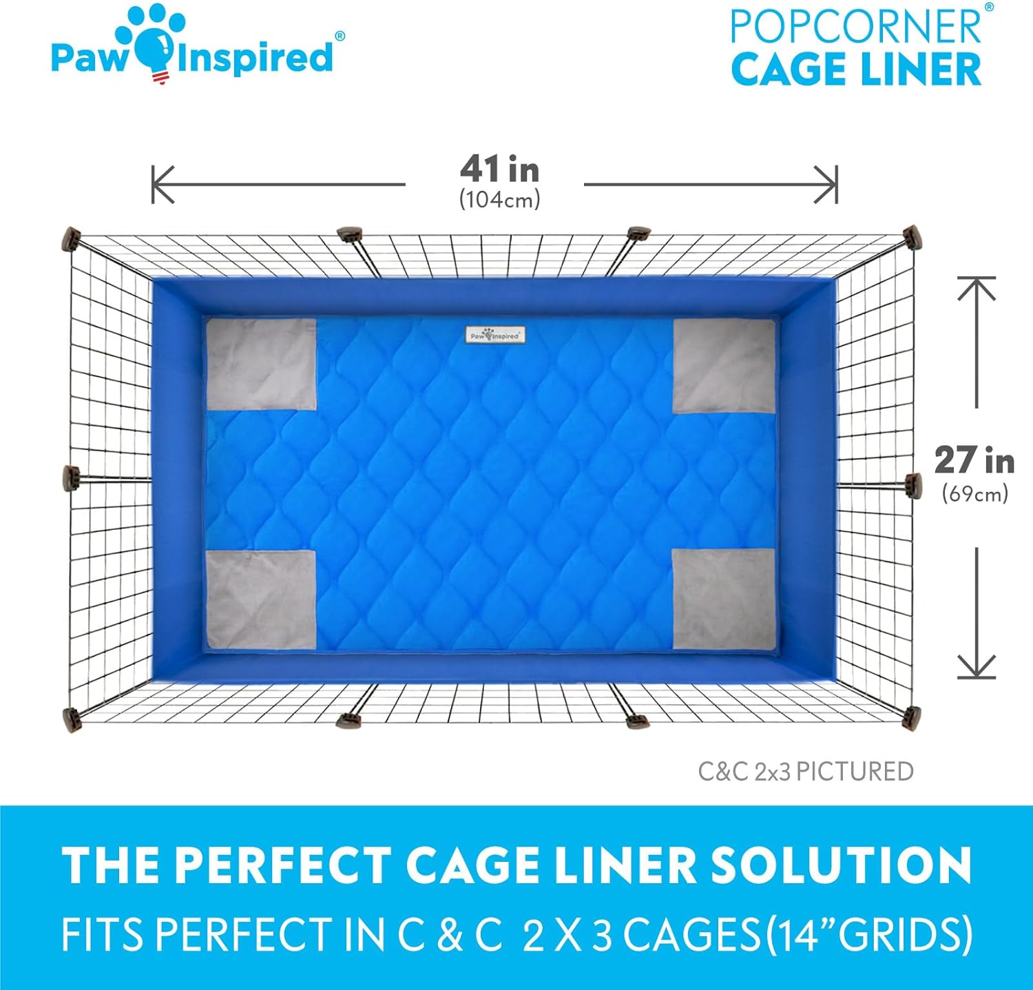Paw Inspired PopCorner Guinea Pig Cage Liners | Washable Fleece Bedding or Pet Bed Mat for Small Animals | Super Absorbent Pee Pad with Reinforced Corners and Waterproof Bottom (C&C 2x3, Blue)