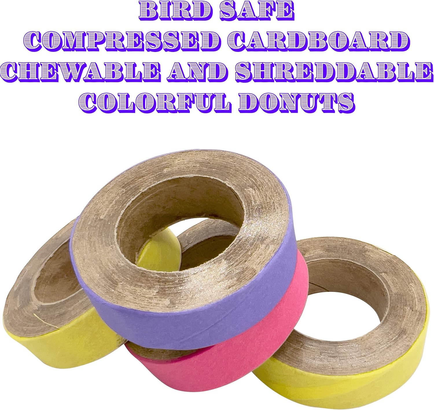 - The chew donuts are made from many layers of paper compressed into a ringer. The outer layer of each donut is brightly colored helping it to stand out in any cage, aviary or birdy environment.