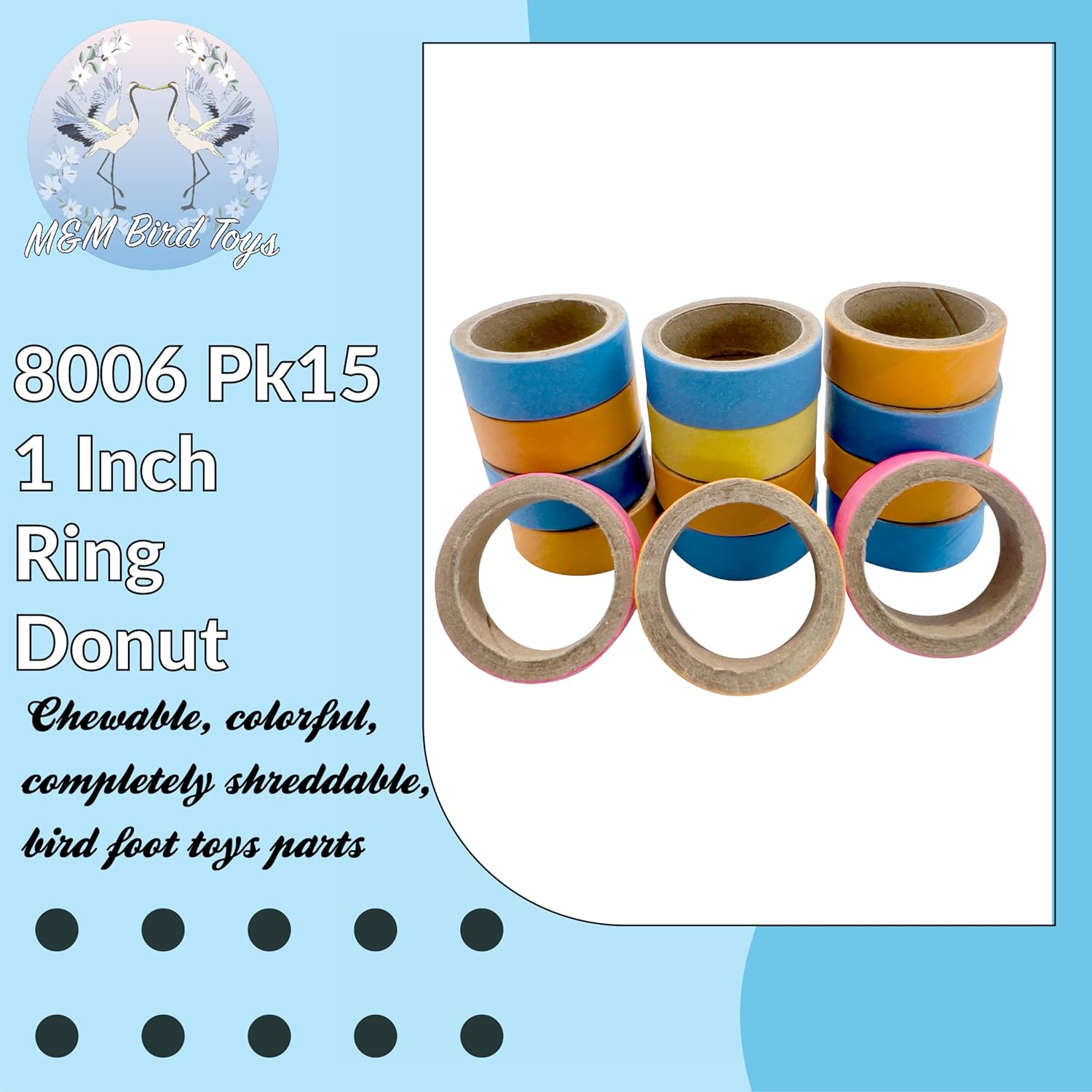 - The 8006 Pk15 1 Inch Rind Donut from M&M Bird Toys are lightweight shreddable colorful foot toys. This pack includes (15) ready to play with colorful compressed cardboard mini (1) inch ring donuts