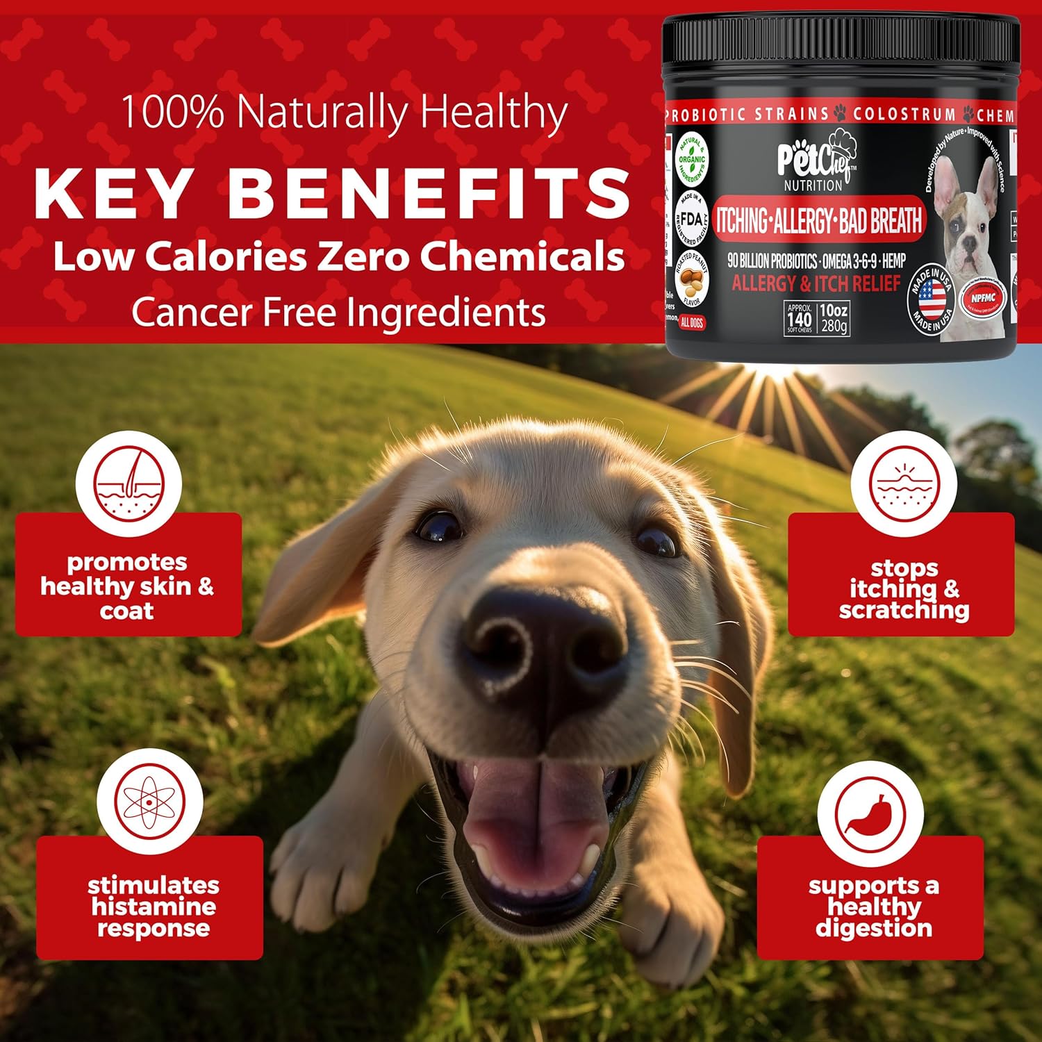 - Keep your pup happy and itch-free with Pet Chef Dog Itching Stopper and Allergy Defender: Tame relentless itching and soothe irritated skin with this natural solution, specially crafted as a dog allergy relief chew. Infused with Omega 3 and Salmon Oil, it effectively moisturizes and nourishes your dog's coat, providing immediate allergy and itch relief for dogs. Witness a joyful transformation in your pet's demeanor as these allergen-free chews enhance their well being and comfort.