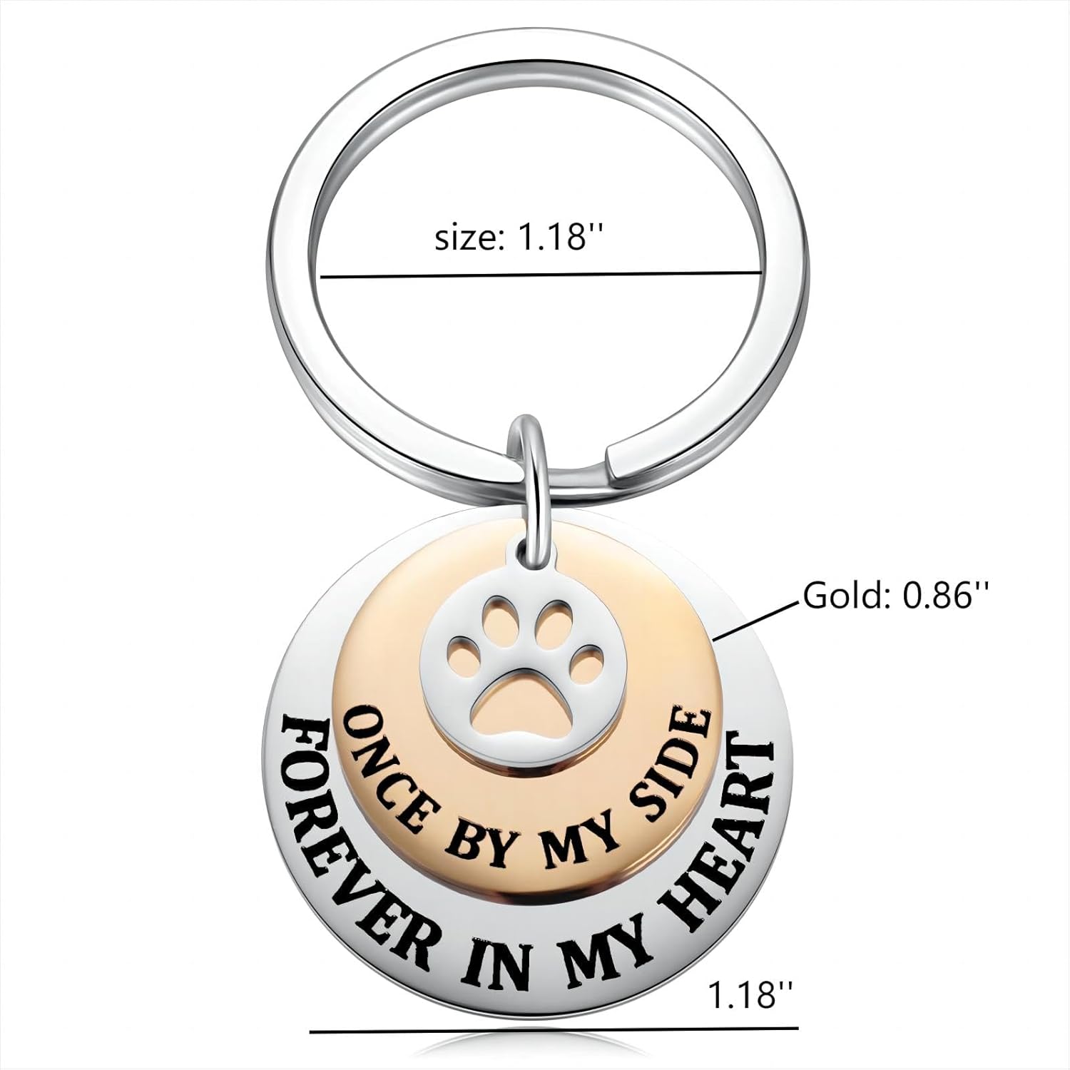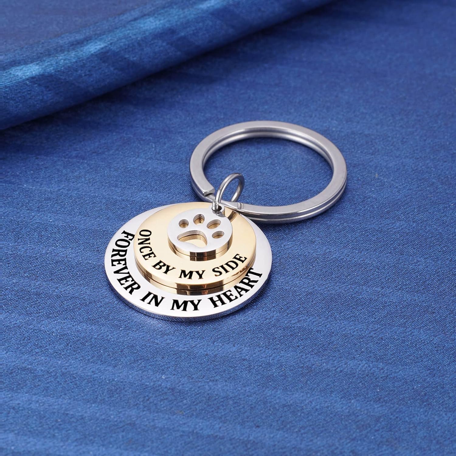 - Pet Memorial: Tri-Layer Keychain says "once by my side, forever in my heart" featuring with a paw print charm, thank you for being a member of the family. Never forget your smile and the little paw, forever in my heart.