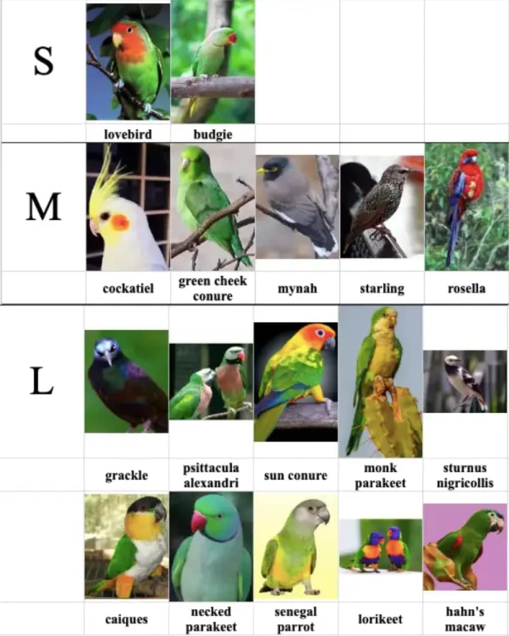 - There are 3 sizes for you to choose. Suitable for small and medium size birds such as Lovebird, Budgie, Green Cheek Conure, Cockatiel, Mynah, Starling, Rosella, Grackle, Psittacula Alexandri, Sun Conure, Monk Parakeet, Sturnus Nigricollis, Necked Parakeet, Senegal Parrot, Hahn’s Macaw, Lorikeet, Eclectus, Caique and etc.Please refer to the size chart provided by us.