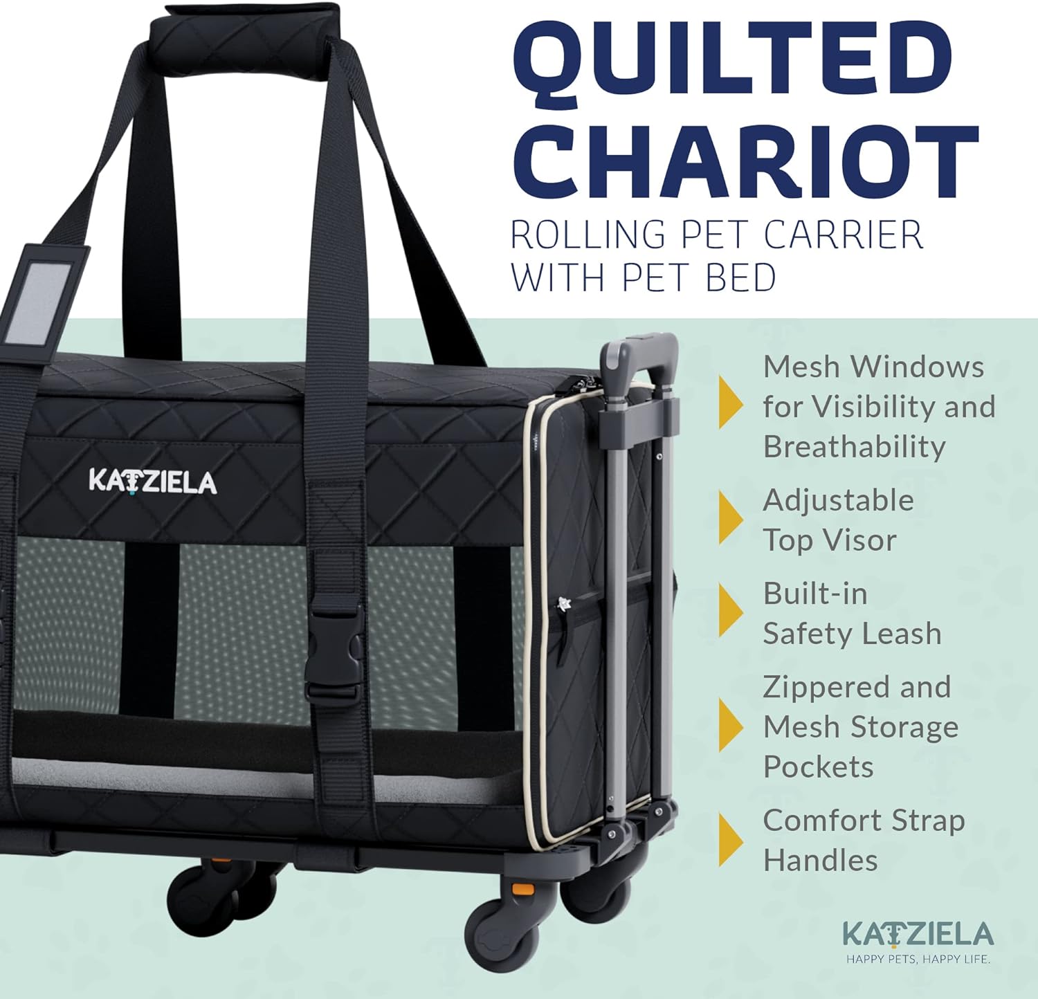 - CAR OR PLANE, THE QUILTED CHARIOT AWAITS - With a super soft machine washable bed pad, optional sun guard, high-ventilation mesh sides, and lockable zippers, the dog carrier airline approved Quilted Chariot is animal luggage elevated.
