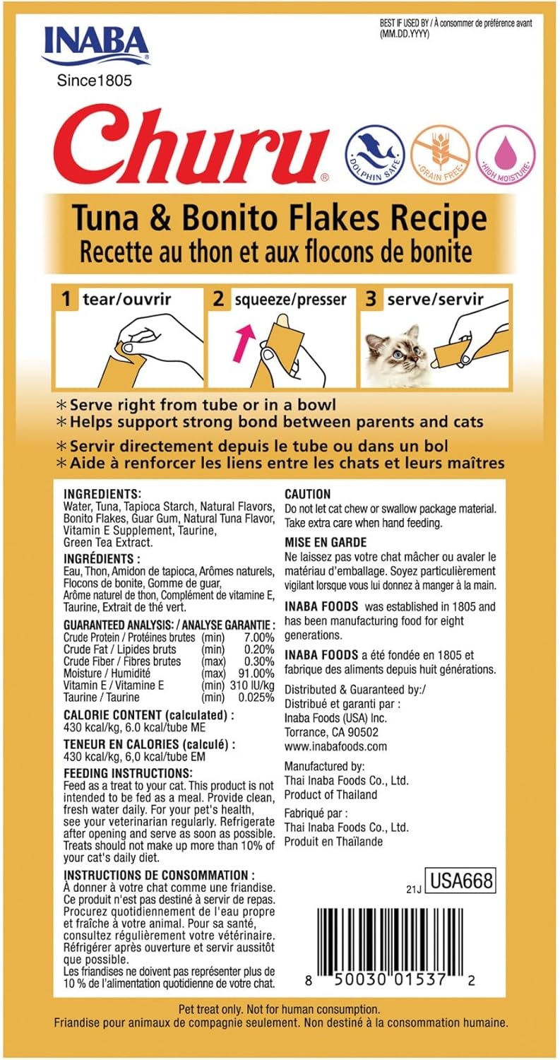 INABA Churu Cat Treats, Grain-Free, Lickable, Squeezable Creamy Purée Cat Treat/Topper with Vitamin E & Taurine, 0.5 Ounces Each Tube, 24 Tubes (4 per Pack), Tuna with Bonito Flakes Recipe