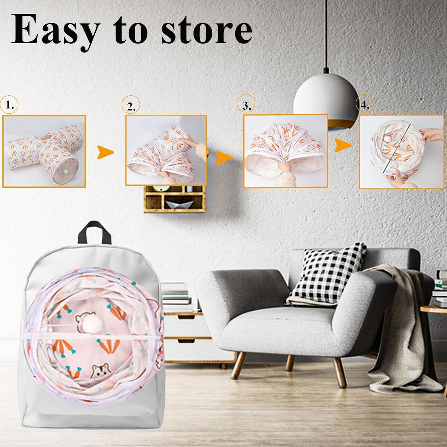 - 3 Way Play Tunnel: The cute cartoon pattern of rabbit and carrot is more suitable for your cute furry pet and attract their attention. There's also a hanging ball inside the tunnel, which is the perfect bunny hideout for your bunny. It will play, hang out, nap and lie down in tunnels. Your pet can jump in and pop out of the hole at the top.