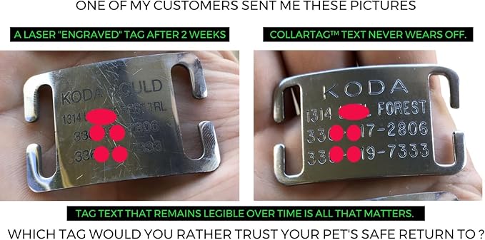 - Text Won't Wear Off - Deeply engraved with a diamond under high pressure, these personalized dog tags are guaranteed to last the life of your pet. The engraved text on these dog tags will not fade or rub off, even after years of use. These custom dog tags can be personalized with 1 to 5 lines of easy to read, deep engraved text.