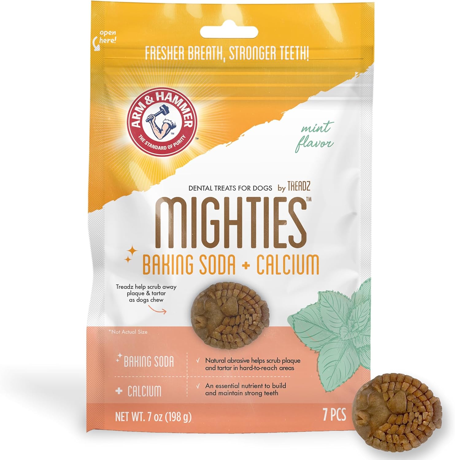 Arm & Hammer for Pets Mighties by TREADZ Dental Treats for Dogs with Baking Soda & Calcium, Help Fight Bad Breath, Plaque & Tartar, Mint, Tough Puffer Shaped, 7 Pcs (Packaging May Vary)
