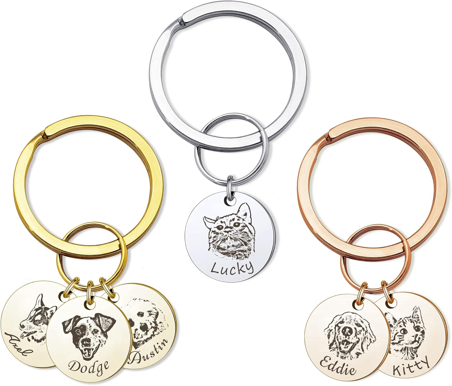 - Personalized Pet Portrait Photo & Name Multi-Disc Keychain - Turn your beloved pet's photo into a sketch-style handmade engraved keychain. We are able to do almost all the pet photos, not only cats and dogs, but also rabbits, parrots, guinea pigs, hamsters, horses, etc. It is an elegant and sentimental memorial keepsake gift for pet owners. Keep your angels with you all the time. Surprise your loved one with this special and dainty multi-disc portrait photo key chain gift.