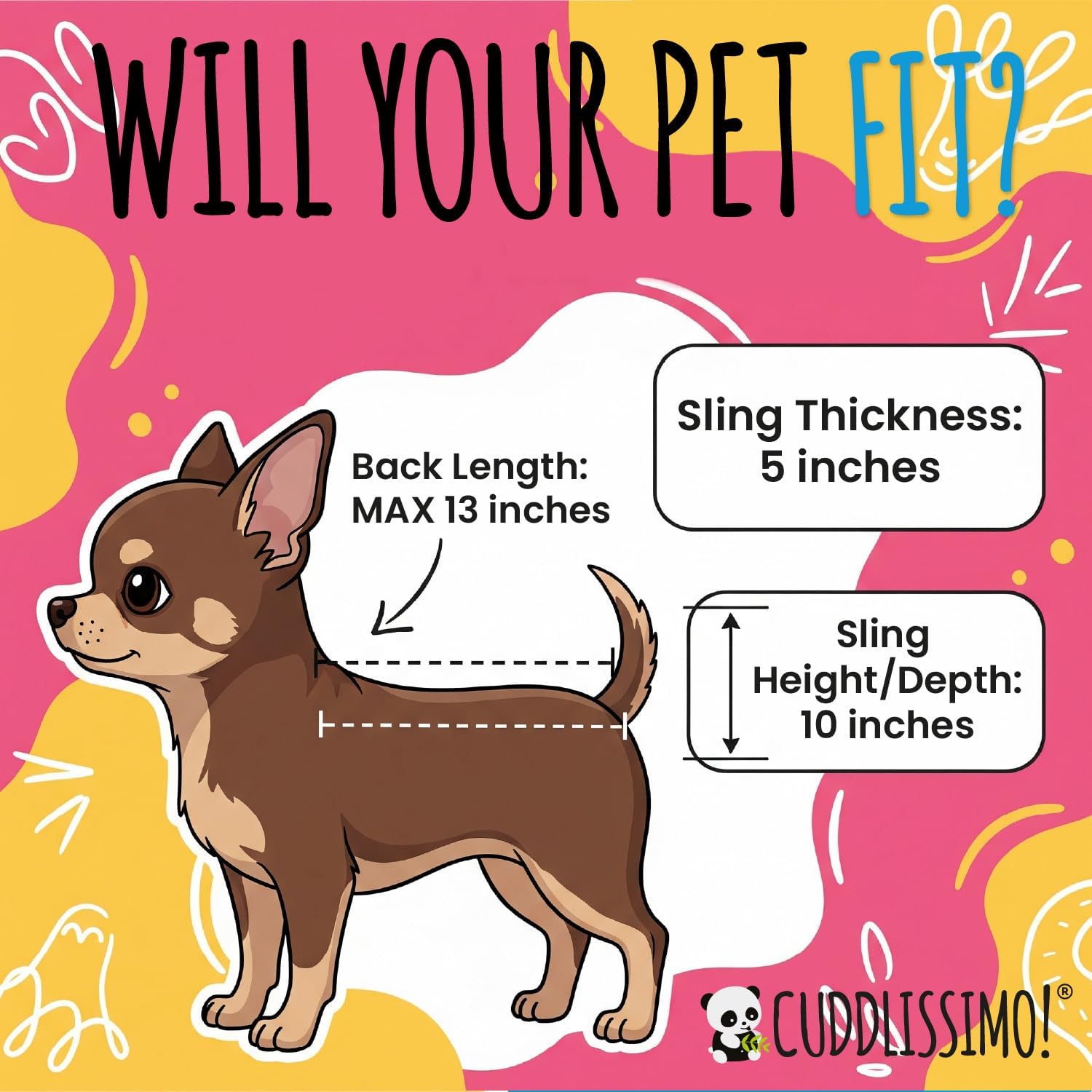 - 🐶 PERFECT FOR MEDIUM PETS - Cuddlissimo! pet sling carrier is designed for medium sized dogs or cats, up to 12 pounds in weight. This dog sling has a padded bottom, and the neck opening is fully adjustable.