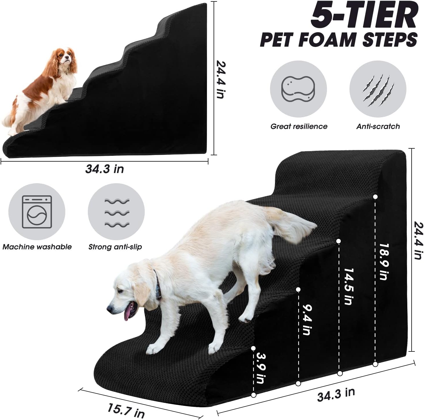 Dog Stairs&Steps for High Beds Up to 28'', 5-Step Dog Ramp for Small Medium Dogs with Washable Cover, Pet Steps for Cats to Get on Couch and Sofa, Durable Foam Ladders, 24.4" Tall, Black