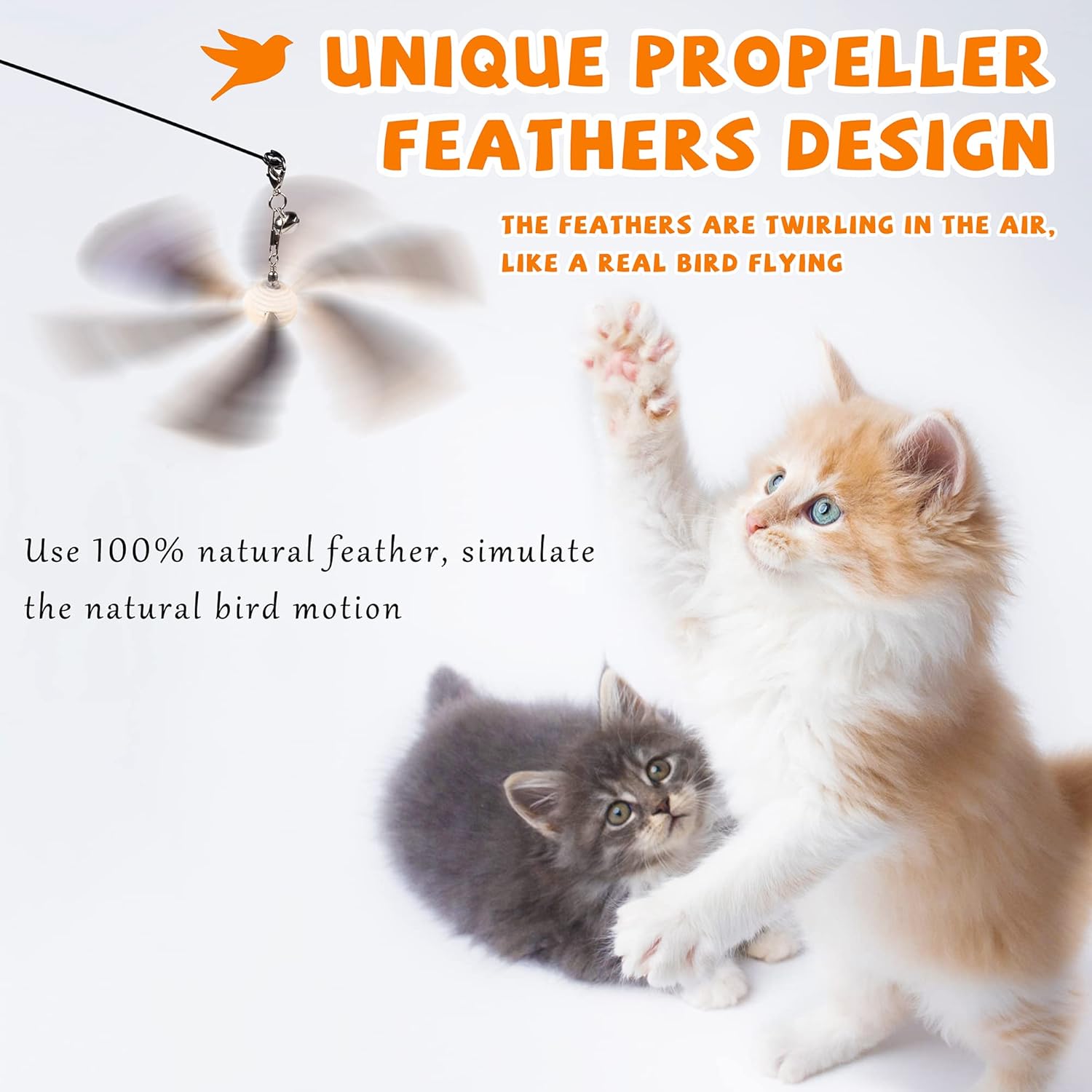 - UNIQUE CAT WAND TOY: Swing this cat wand toy gently, with the crisp bells, the high-stretch steel wire drives the feathers to whirl, it looks like a real bird is flying in the air. And cats can’t help chasing, batting, pouncing, swatting and biting it.
