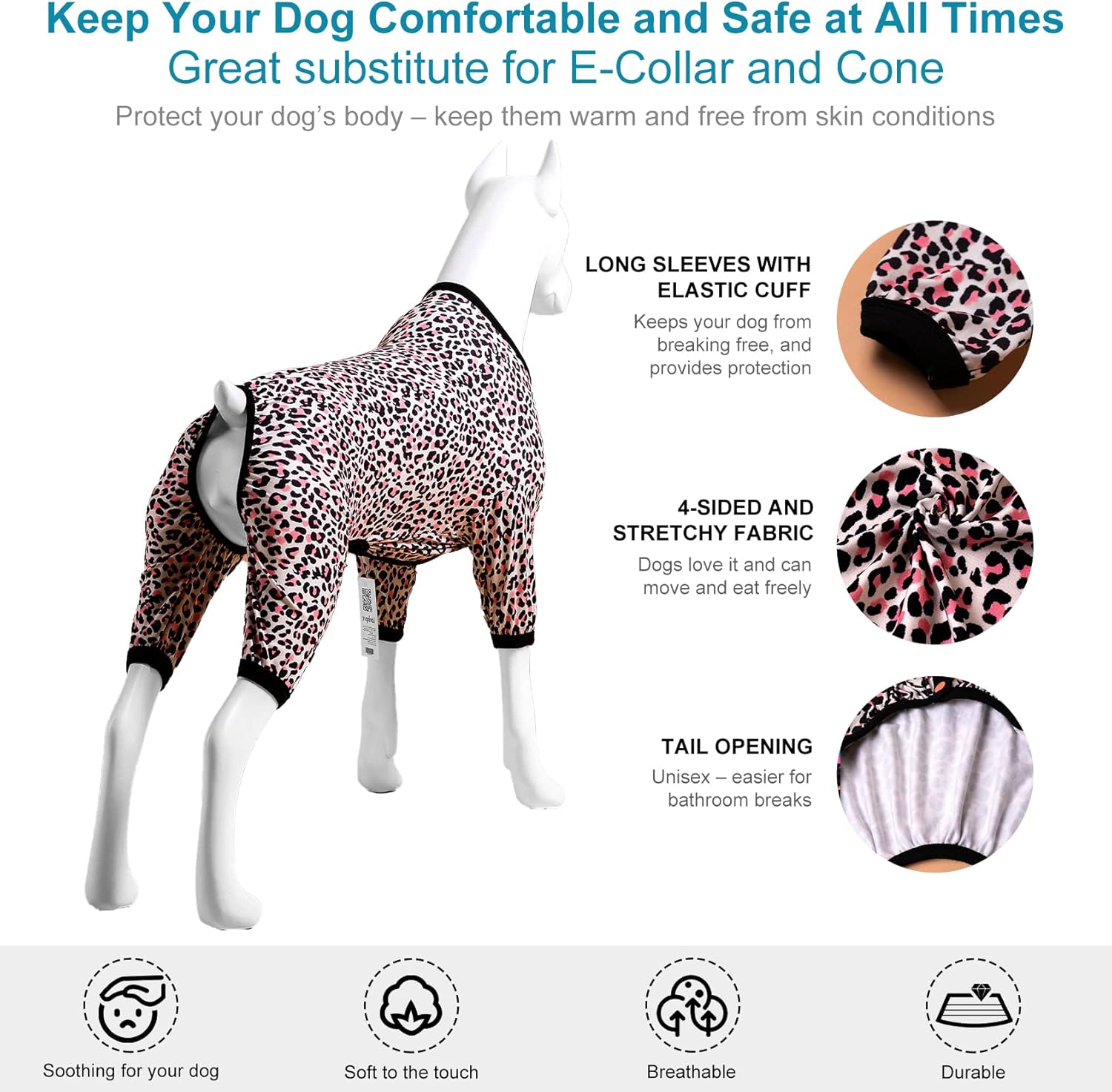 - A Buyer's Story: Got this for my big dog after having a minor surgery on his hind leg (right where it meets his belly) to prevent chewing/licking instead of a cone. Fits great and is doing the job so far. Material has a nice stretch without digging in. Not super thick material which is good for preventing overheating. Fit is perfect.