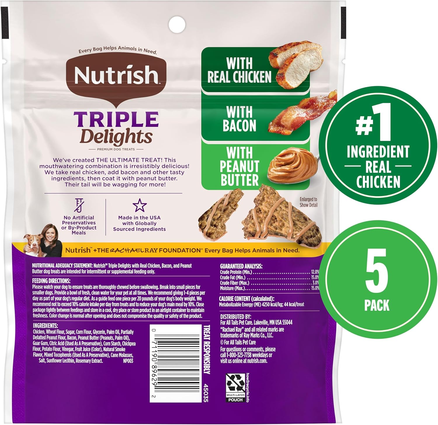 Nutrish Triple Delights Premium Dog Treats with Real Chicken, Bacon, and Peanut Butter, 4.5 oz. Pouch, Pack of 5