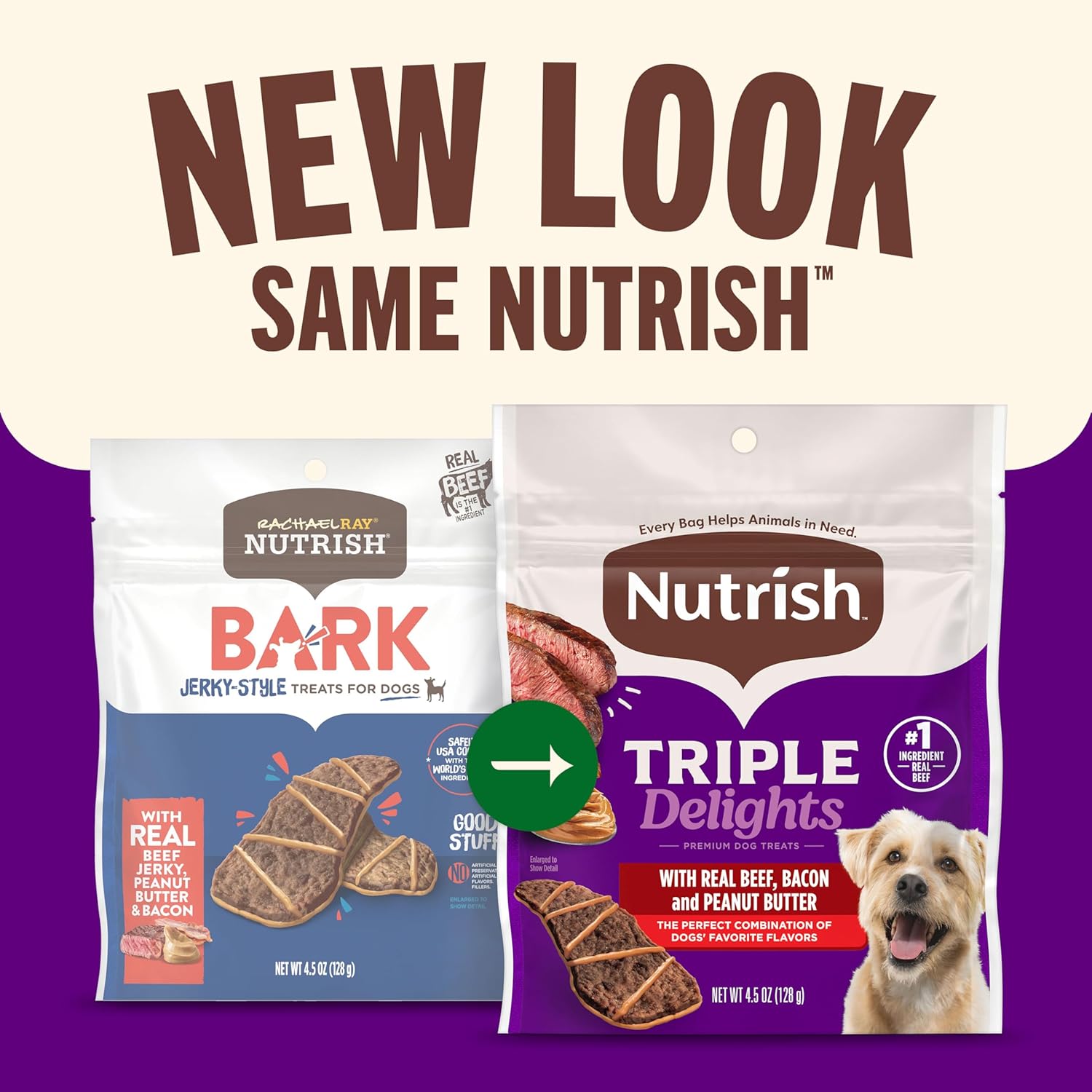 - Contains five (5) 4.5-ounce pouches of premium dog treats (Rachael Ray Nutrish) with real beef, bacon and peanut butter for dogs of all ages