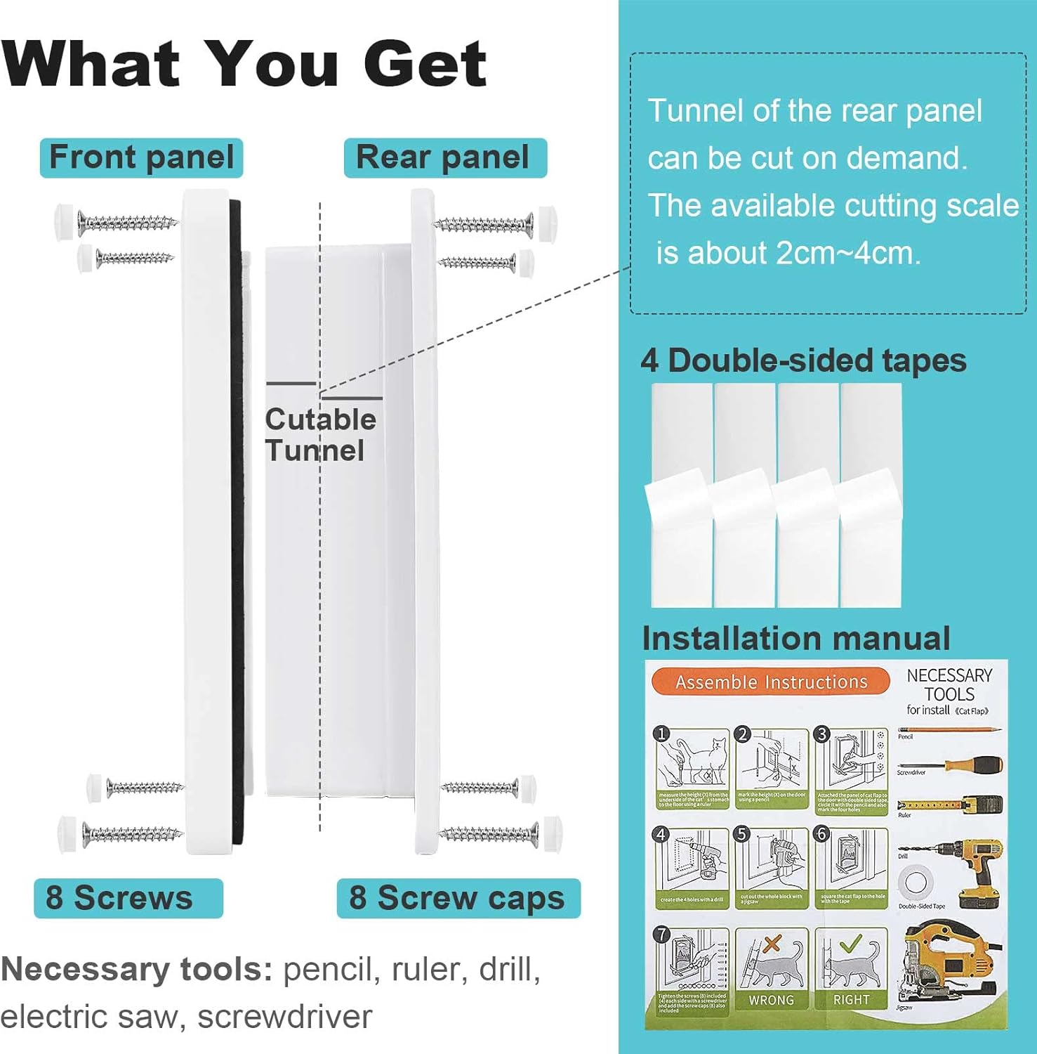 - Easy to Install - The cat door for exterior door comes with detailed instructions, 8 screws and their caps, double-sided tapes. After the necessary tools are ready, you can DIY easily. In addition, the tunnel depth can be cut on demand.