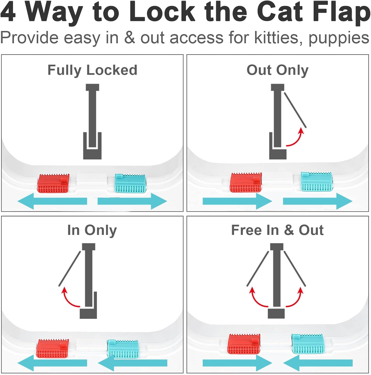 - Safer with 4 Lock Modes - By slide the switches, you can adjust the access mode to Free In & Out, Fully Locked, Out Only, In Only, control your pet’s access and keep away stray animals.