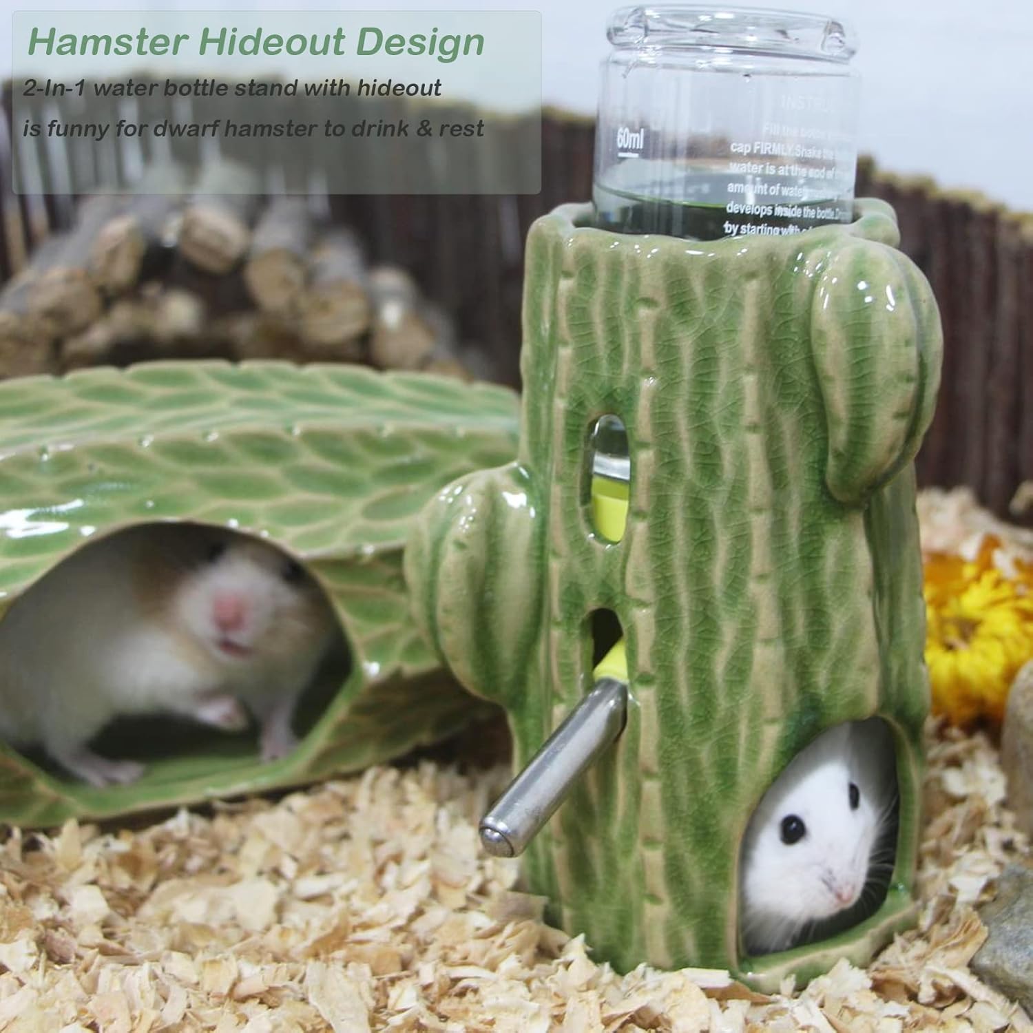 Hamster Water Bottle for Glass Tank, 3-in-1 Adjustable Ceramic Cactus Water Bottle Stand with Holder Dispenser 80ML No Drip for Syrian Dwarf Mice Rat Gerbil Guinea Pig