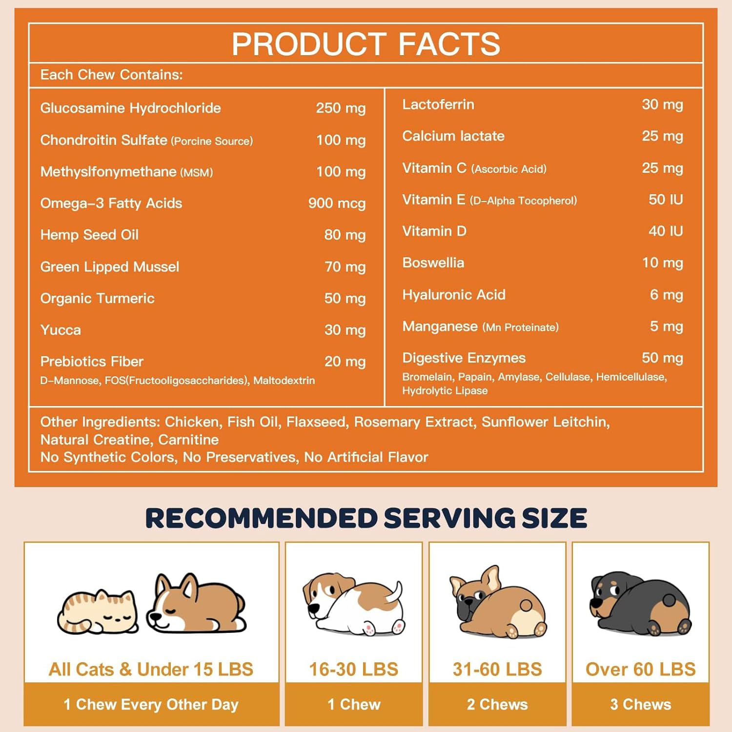 - Lubrication & Resiliency Boost: Chondroitin sulfate and Hyaluronic acid help to promote hydration and elasticity and lubricate joint fluid. They worked as shock absorbers to protect connective tissues and cartilage health. Chondroitin blocks enzyme levels and supports cartilage's compression resistance. Dog joint supplement large breed chews are excellent for pets' long-term use and maintenance. They are designed for all sizes and breeds of dogs & cats, especially older and highly active dogs.