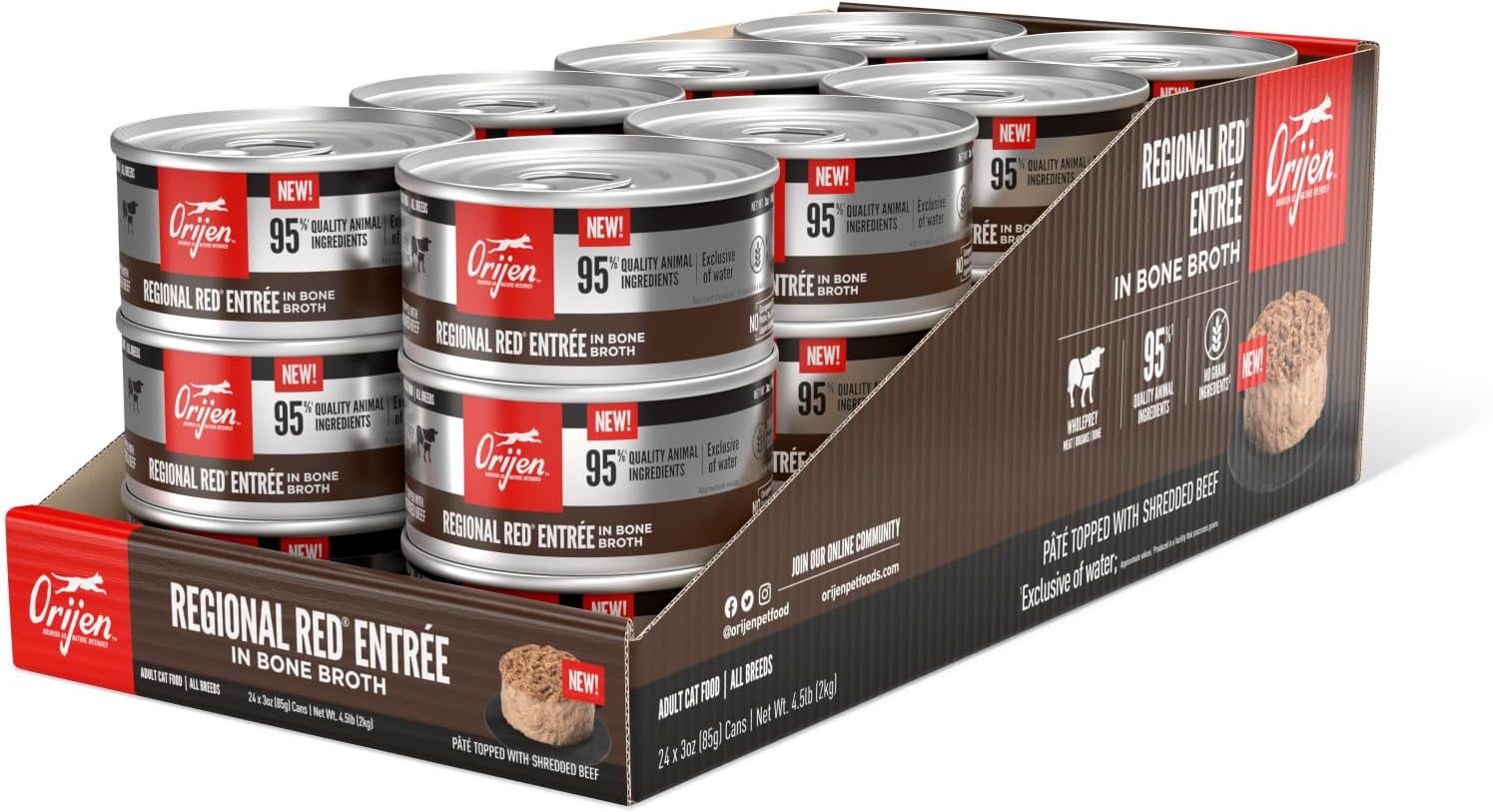 - Twenty Four (24) 3 oz cans of ORIJEN Adult REGIONAL RED Entree in Bone Broth Wet Cat Food