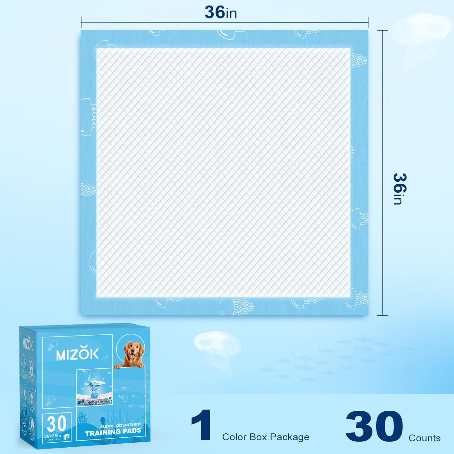 MIZOK 36x36in Dog Pee Pads Jumbo Disposable Dog Training Pads Super Absorbent Up to 11 Cups Marine Scented Odor-Control Dog Pads with Jellyfish Pattern, Quick Dry & Leak-Proof (30 Counts)