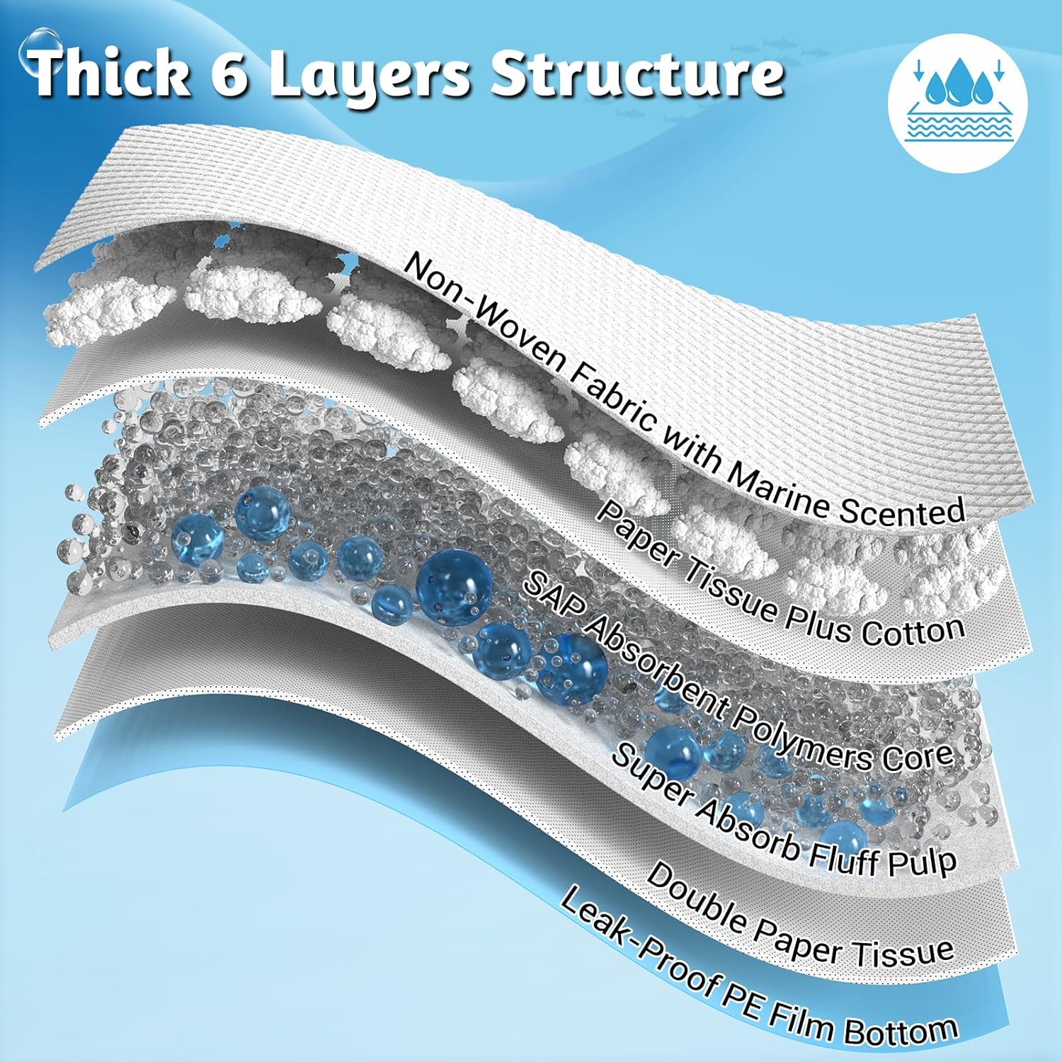 - Innovative 6-Layer Design: The paper part of this product comes from FSC-certified paper; Top non-woven fabric layer for quick absorption and fast drying; second paper tissue layer to absorb liquid; third layer of super absorbent polymer to turn liquid into gel; fourth layer of fluff pulp for extra moisture control; fifth layer of paper tissue for added protection; sixth layer of PE film to prevent leaks and protect floors